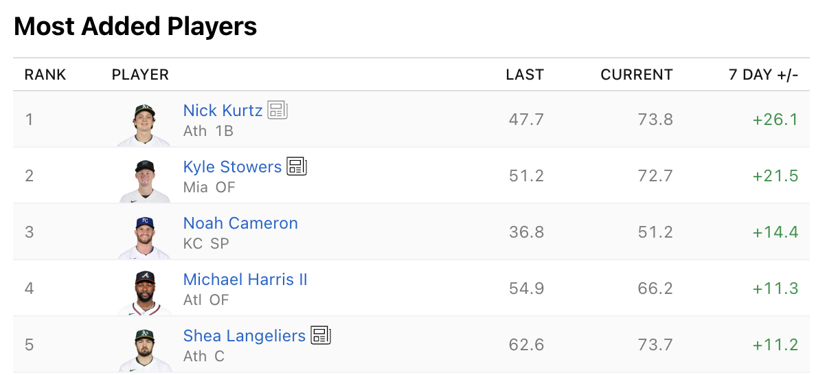 ESPN’s list of most-added players features a lot of names we’ve touched on recently. Three of these players are now owned in more than 70% of leagues: Nick Kurtz, Kyle Stowers, and Shea Langeliers. There’s not much left to be said about those guys, and if they’re still available in your league, go out and grab them while you can.