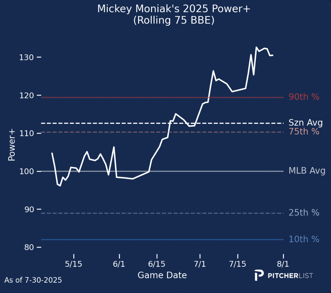 Moniak is one of the best sources of power that is widely available across most leagues. He’s up to 16 homers for the year, and he’s made huge strides from a power standpoint in recent weeks: