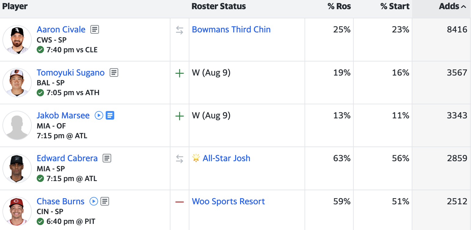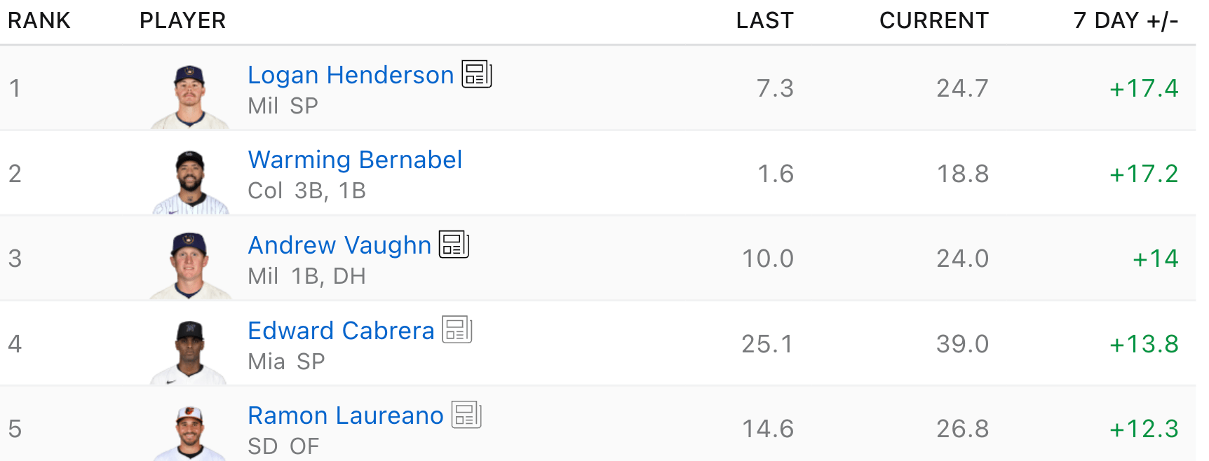 Logan Henderson, as the most added player, is a bit shocking, as he plays the Mets today. He is filling in for Jacob Misiorowski, who is on the IL but likely won’t be for too much longer. Henderson is a solid arm who can help against weaker matchups, though again, I’m not sure if he deserves to be added in droves despite the Mets struggling as of late.