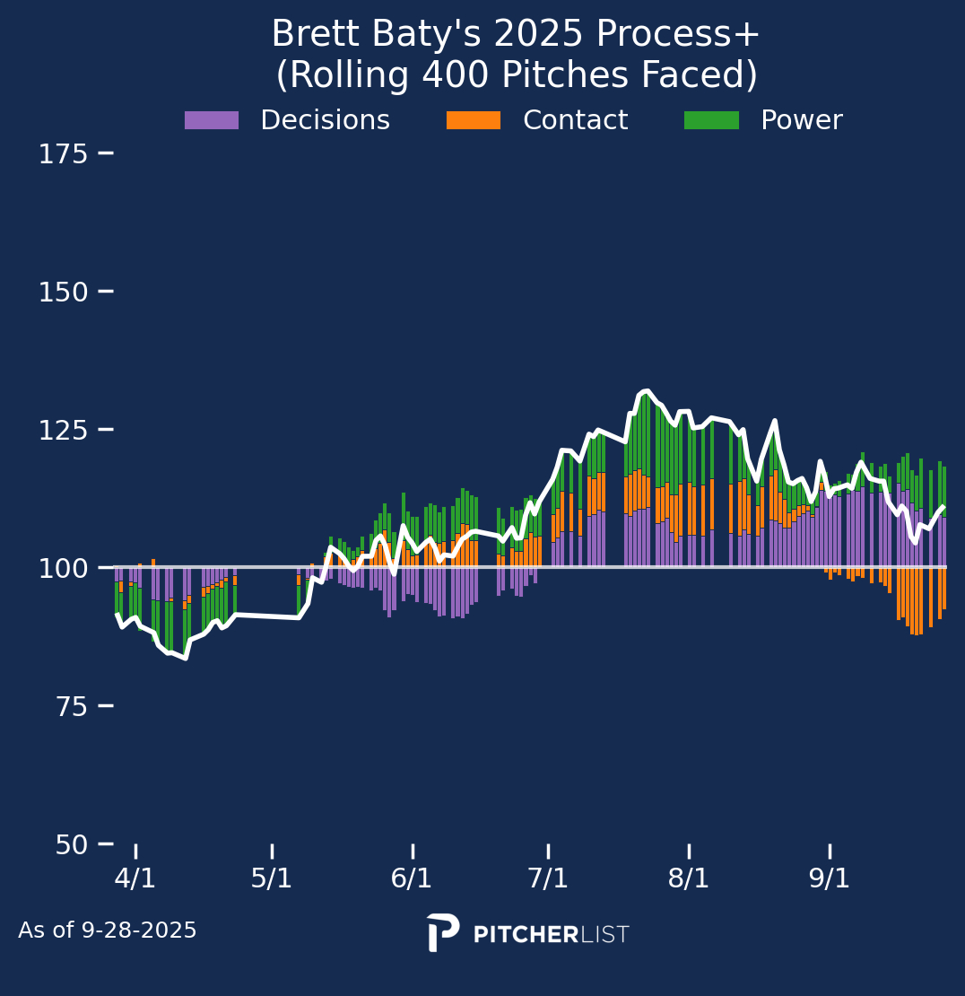 We can see that he opened the year with a month-long stretch of poor at-bats amid concerns that he was still the same underwhelming player that Mets fans had become frustrated with in his first few years with the club. All three metrics (power, contact, and decision-making) were dragging him downwards, instead of upwards. However, at the beginning of May, he began to unlock a power and contact combination that started a consistent trend upwards—a trend that continued through an impressive peak in July that brought his Process+ above the coveted 125 mark. Even his decision-making turned positive at the beginning of that month, and remained so through the rest of the season. The fact that Baty was able to consistently maintain this new and improved approach for a four-month stretch bodes very well for the type of player he could be in 2026.
