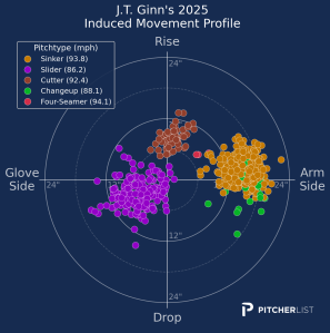 Ginn and Quinn are both defined by their heavy sinkers, with usage at 55.9% and 43.2% respectively. Ginn, more so than Priester, has an immediately clear strategy with it, as he loves to pepper the glove side of the zone, hunting called strikes and setting up his other pitches out of the zone there. Comparing the two pitches based on their stuff, I slightly prefer Ginn’s due to the exceptional seam-shifted wake he creates. The observed movement is so far off compared to its initial spin direction. Priester’s sinker is hardly a slouch, though, creating nearly identical steepness by staying more upright in his delivery and releasing the ball from a higher point than Ginn does. I do want to give Ginn a slight “funk” bonus for how low his release is despite his arm slot being what it is. He creates a really strange look with his mechanics.