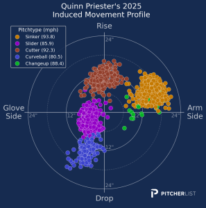 The last pitch either of them throws is Priester’s curveball. Ginn does not offer one. What this pitch lacks in elite velocity or movement, Priester makes up for with his ability to spot it. He drops this just below the zone with excellent consistency, allowing a pitch with mediocre stuff to run above-average chase and whiff rates. Hitters have a hard time squaring it up when they do get the bat on it as well. Lots of hard-hit grounders and 300-foot flyouts. Nothing that would actually cause substantial concerns.