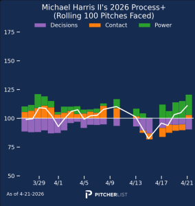 Harris has never been a particularly good decision-maker at the plate; his 5.8% walk rate and 17.4% K rate this year would both be career highs. His power is showing up early this year, though, and he has historically had strong contact ability. Through yesterday’s games, Harris is swinging half a mile per hour harder than he did in 2025, equal to his 2024 bat speed, and swinging hard on nearly half of his swings, about 9 percentage points more than last year and also similar to 2024. The main change has been he’s squaring up the ball more frequently than he has in the past. Despite running a 6.8-degree average launch angle, which is nearly a degree flatter than his previous three years, Harris is actually barreling the ball more often thanks to the quality of his contact. He’s already posted the hardest-hit ball of his career at 114.9 MPH this season, and has increased his average exit velocity to a Stantonian 94.8 MPH. It’s hard to believe that Harris will maintain this level of power throughout the year, but he’s certainly earned everything he’s gotten so far, with his .296 AVG and .543 SLG underperforming their expected counterparts by 32 and 59 points, respectively.