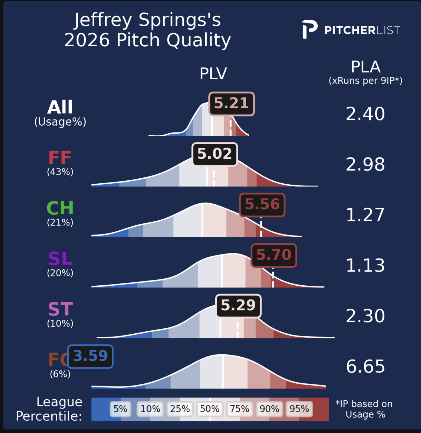 Springs’ stuff is pretty solid. His fastball isn’t particularly high-velocity, but it’s up a tick from the past season. It also sees some newfound vertical movement, something he seemed to have lost on the heater coming back from Tommy John. Of course, the conversation about Springs centers around his plus-changeup, which he has used to make batters look foolish for years. The term we’ve been using at Pitcher List lately has been SWATCH (Southpaw With A Tight CHangeup), and it feels like Springs is the poster child for this, as he uses that pitch to succeed despite not having an overpowering arsenal. Springs also features a slider that he uses quite a bit, and our in-house pitch evaluating stat, PLV, also seems bullish on. He rounds out the arsenal with a looping sweeper that he uses against lefties and a cutter that is pretty meh.