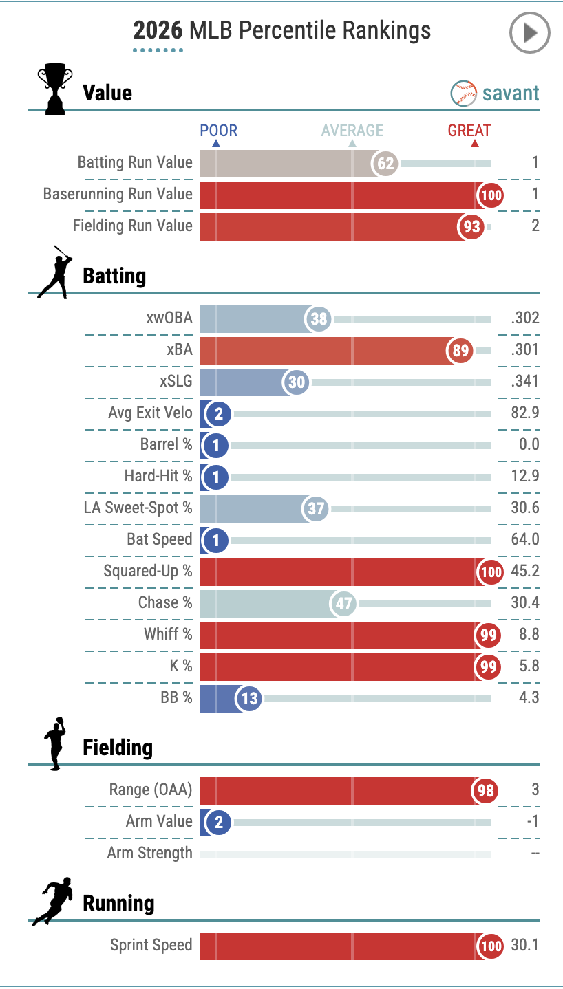 Verdict: Somewhat legit. I think it’s clear that he will have one of the highest batting averages in the Majors over the course of the season and will steal a ton of bases again. Every time he is on base, you can expect some aggressive running as that is what gives him his value. The question about legitimacy stems more from the question of whether his batting average and on-base percentage will remain high enough to keep his value up. I mentioned Arraez earlier, and it’s interesting because, despite an even lower bat speed, you can trust Arraez to be more of a threat to hit home runs. Perhaps Simpson will get some inside-the-parkers, but that takes extraordinary luck, even for the baseball version of The Flash.