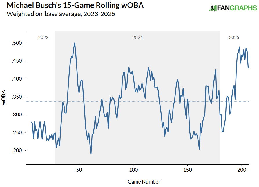 With poor contact rates, poor swing decisions, and a low bat speed, Busch’s overreliance on strong launch angles will continue to make him a very streaky hitter. While some players can put this type of profile together over a full year (see 2024 Jordan Westburg), Busch hasn’t made the improvements to think his hot start is sustainable over a season’s volume. He’s likely to see similar peaks and valleys to his 2024 season.