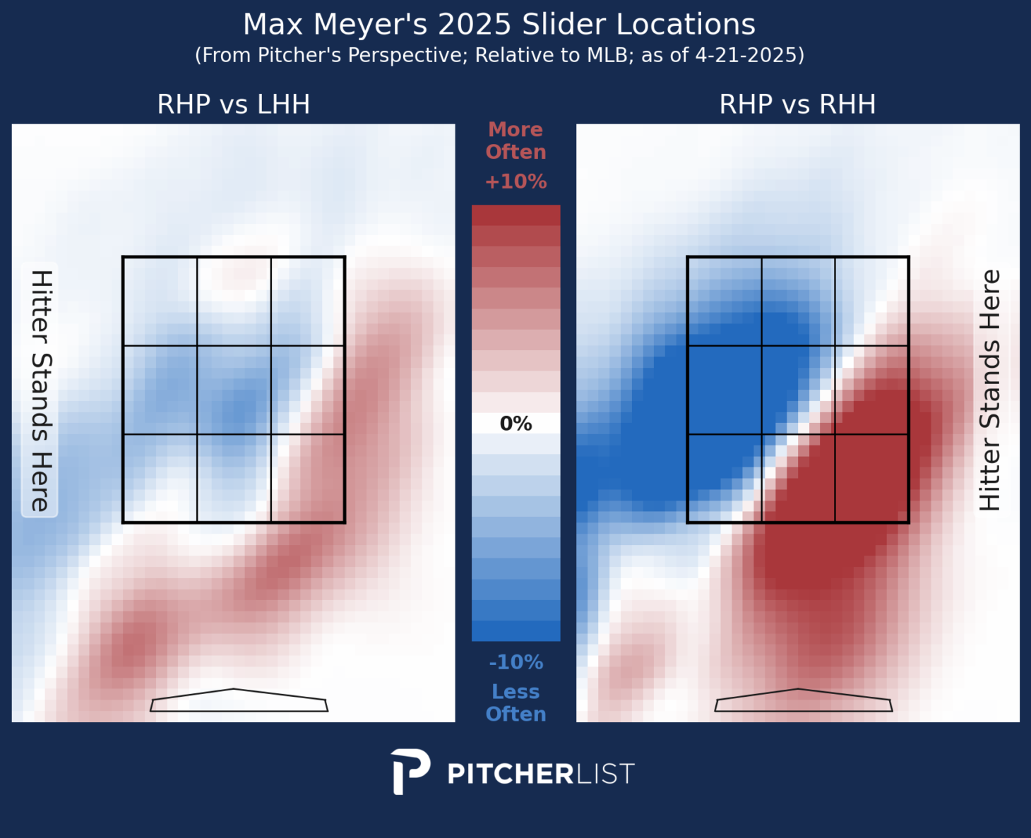 Dropping the usage of his four-seamer wasn’t the only major change that Meyer has undergone this year. His arm slot has dropped an astounding 10 degrees between 2024 and 2025. A major mechanical change like this might lead to a decrease in pitch locatability, but Meyer has actually seen an increase in his location metrics. He’s been able to slide into the bottom edge of the zone at a much higher rate than average, resulting in a strong whiff rate on his most-used pitch.