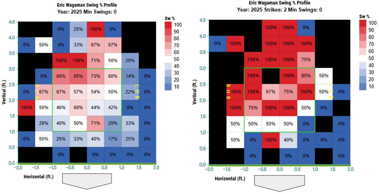 He moves away from his passivity in 2-strike counts, expanding further across the strike zone instead of picking his spots. This has enabled Wagaman to work deeper into counts, strikeout less, and walk more en route to the 20th-best Process metric among hitters that have faced at least 125 pitches.