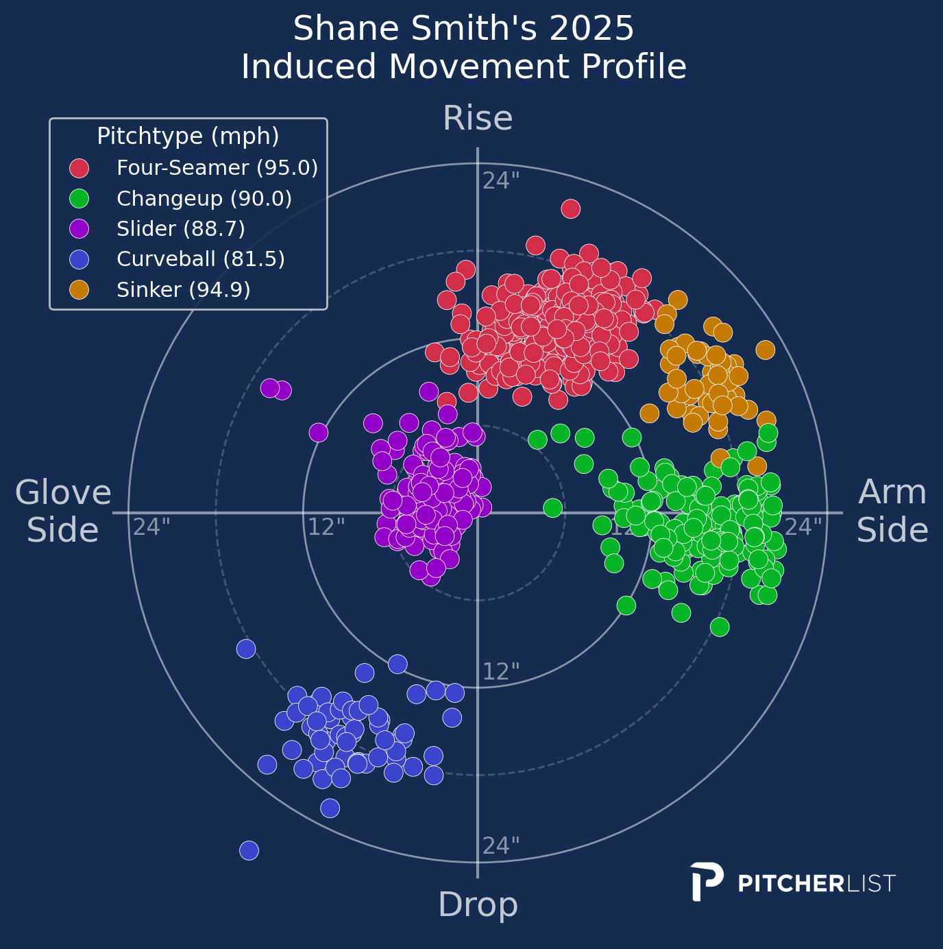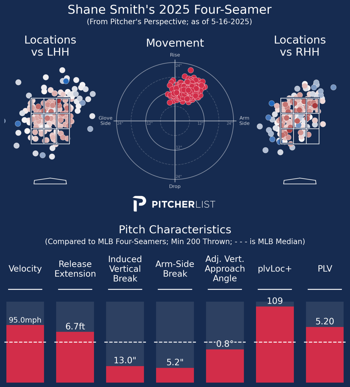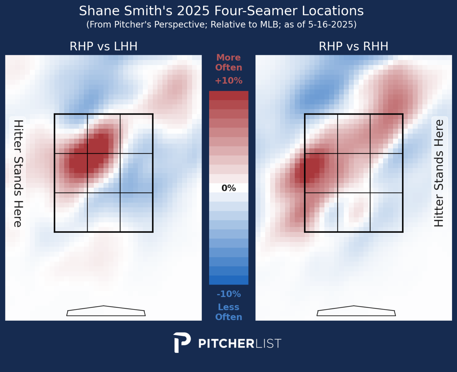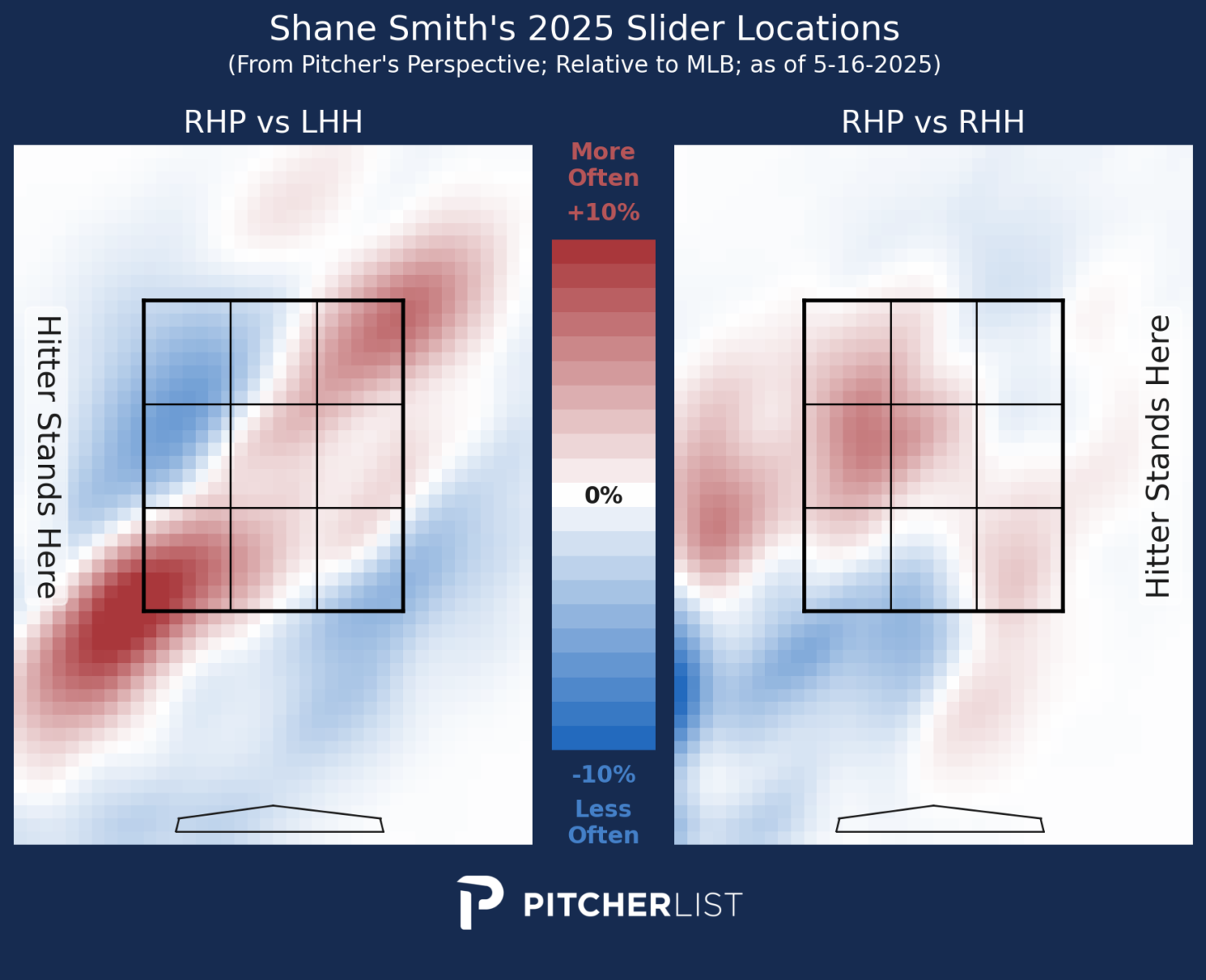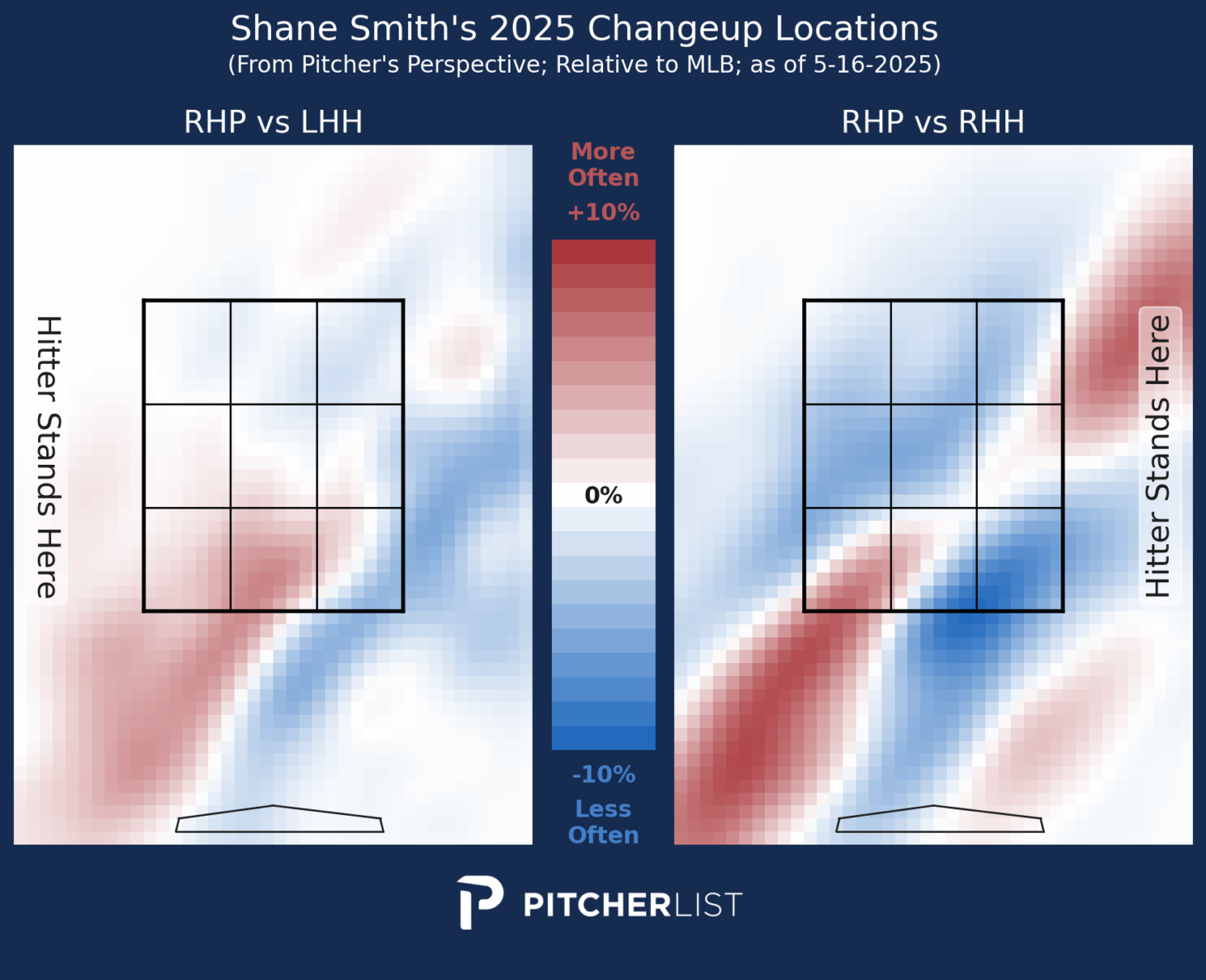 Hopefully, I’m not overdoing it with the visualization, but they are so nice. The slider locations vs. RHB are similar to his four-seamer. Smith throws a gyro slider, so this makes sense. It’s designed to mimic a fastball until it drops late. His slider results are middling, but I suspect it is helping to boost his four-seamer results.