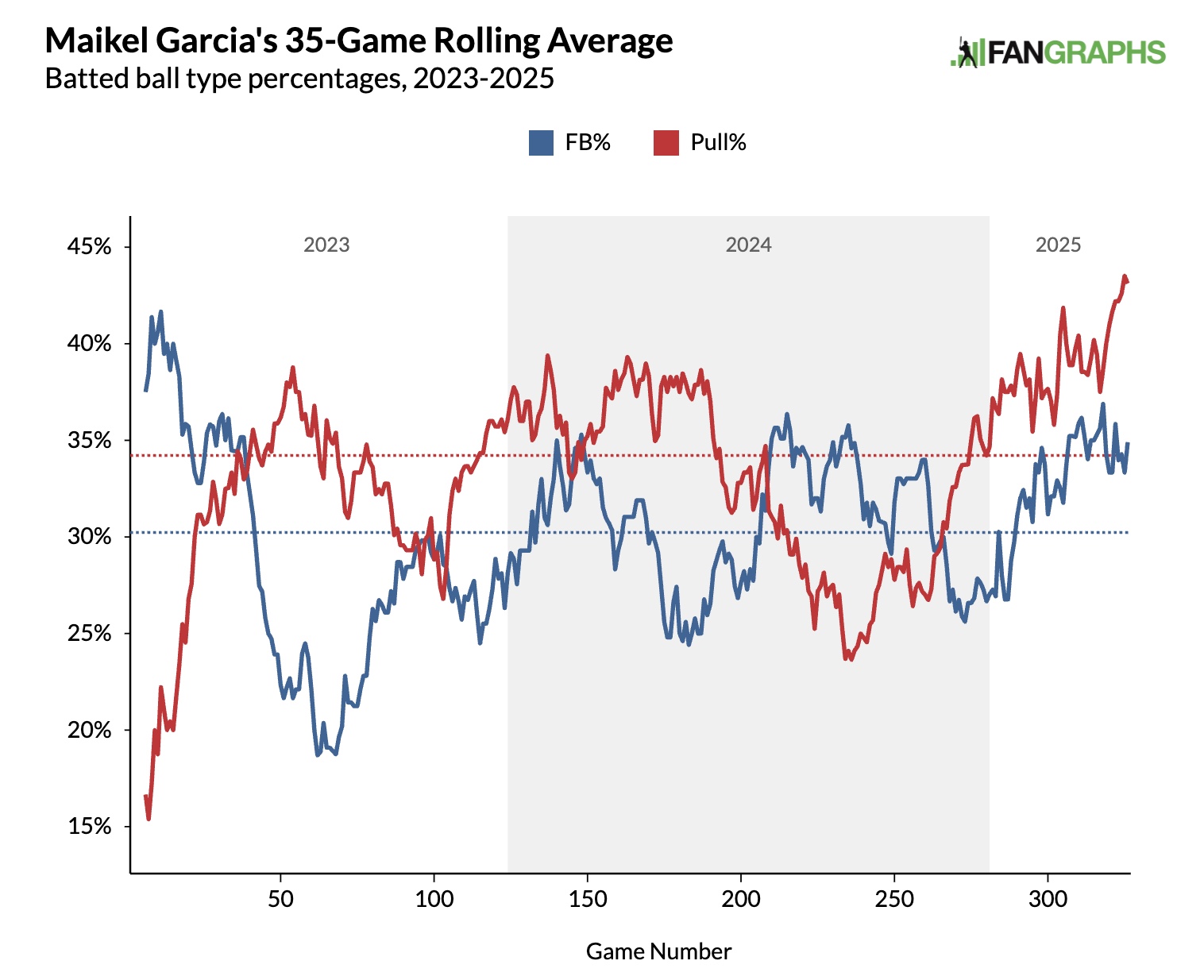 Prior to this year, his Pull% was 32.9% and his FB% was 29.2%. In 2025, those numbers are up to 41.4% and 36.5%, respectively. His Launch Angle is also up to 9.0 degrees, helping to increase his Brl% from 3.6% to 6.4%. In 2023, his Bat Speed was 69.8 mph, in 2024, 70.8 mph, and in 2025, it’s up to 71.9 mph. His Pull Air% has increased from about 10% to a league average of 15.7%. Pulling Fly Balls is the easiest way to hit home runs.