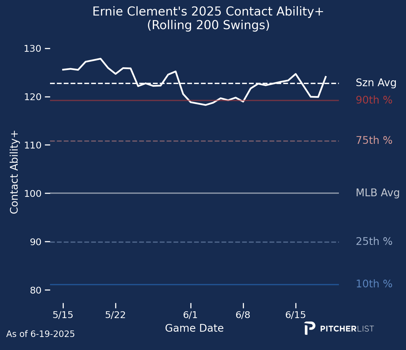 He has displayed elite Contact Ability, and his 85.0% Contact rate is 93rd percentile. His xBA and xBABIP are also well above average.