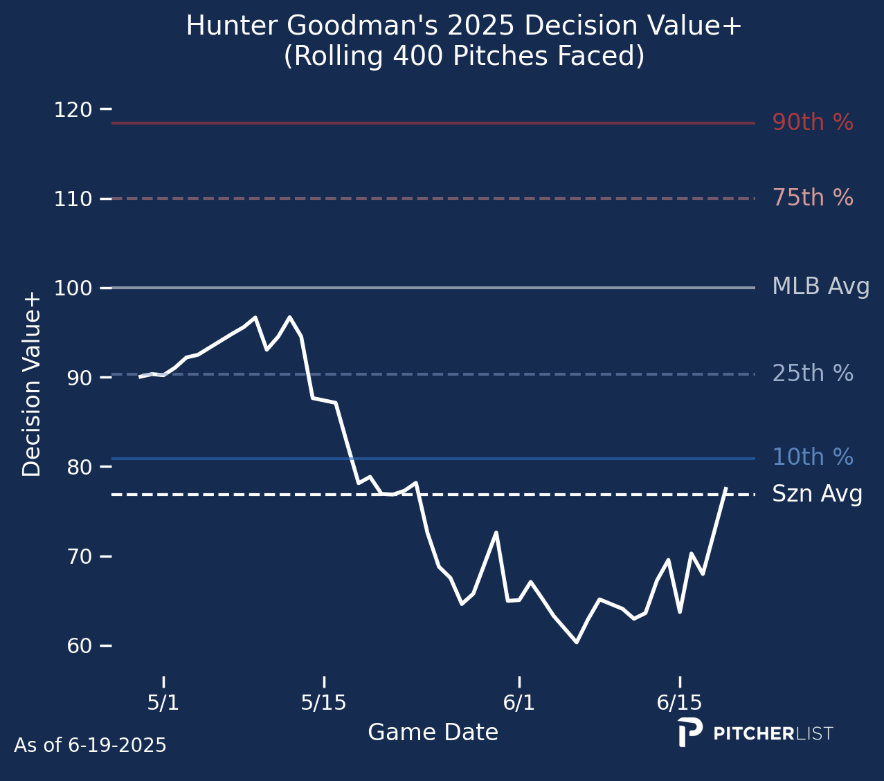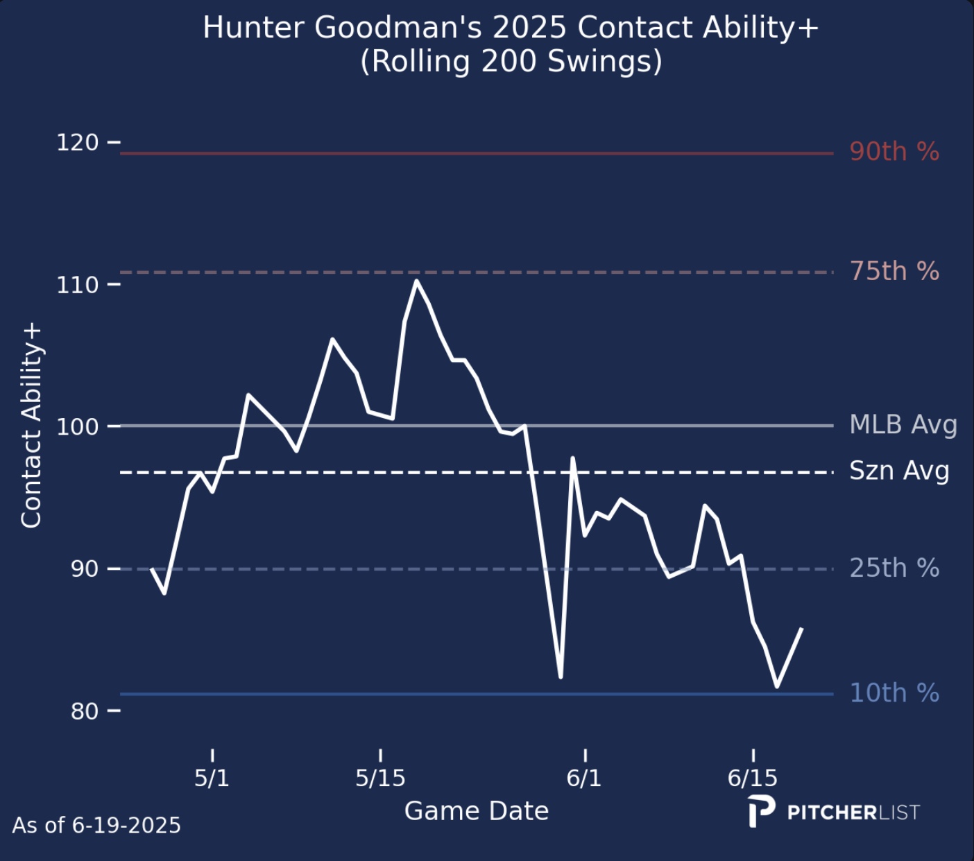 We’re nearly halfway through the season. Most numbers have become meaningful and stable. They are no longer fluctuating wildly with each game. There may be opportunities in your leagues to pick up players off of waivers with unexpected, but legitimate hot starts. You may also be able to trade advantageously by looking at underlying numbers that have stabilized.