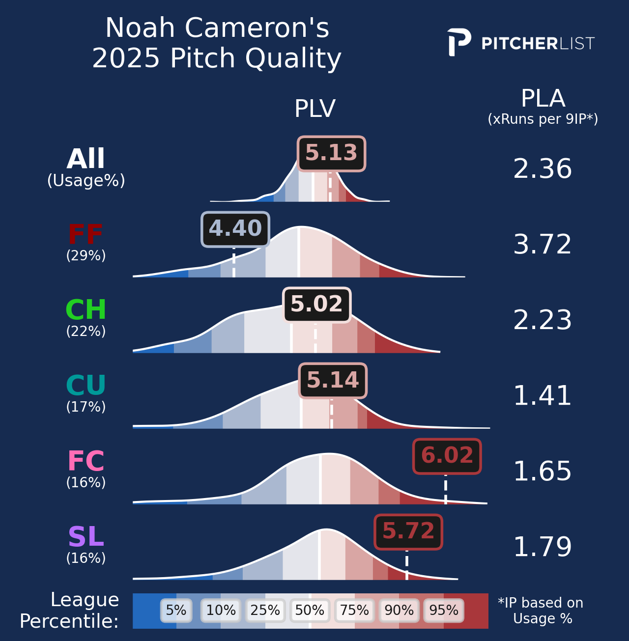 Cameron set himself apart last year by leaning on his control of a large pitch mix to attack hitters. He achieved success through three main pillars: he limited walks, maintained a high strikeout rate through high chase rates and in-zone whiff rates, and limited hitters to weak contact when they got the bat on the ball.