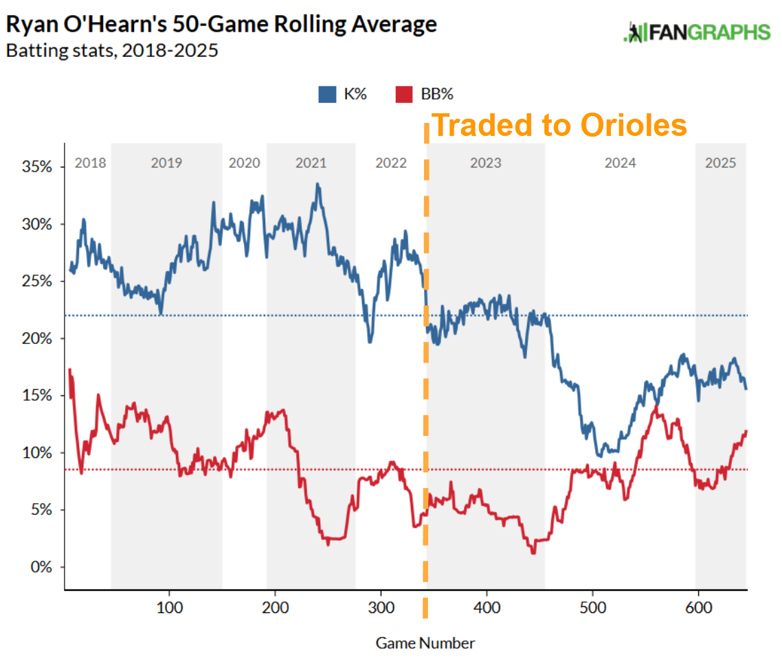 O’Hearn has been a strong-side platoon bat since his time back with Kansas City, collecting plenty of at-bats against right-handed pitching. And for good reason, as he has the 11th best xwOBA against RHP among batters with a minimum of 50 PA against righties so far this season. His platoon has enabled him to grow into strong walk rates and low strikeout rates, which he’s thoroughly improved through his Baltimore tenure.