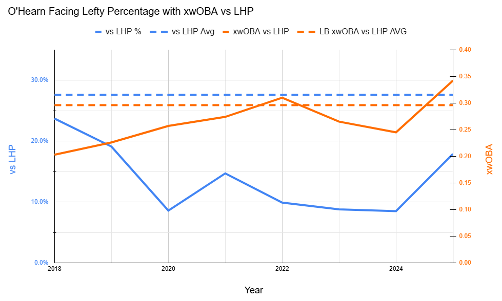 Across the last three years, O’Hearn’s xwOBA takes a significant drop from 0.358 to 0.284 in his limited instances against lefties. His whiff rate jumps from 19.7% to 26.1%, and his EV drops from 91.6 mph to 81.9 mph. Though he might not have a lot of experience against lefties, there’s enough here to think O’Hearn should stay platooned.