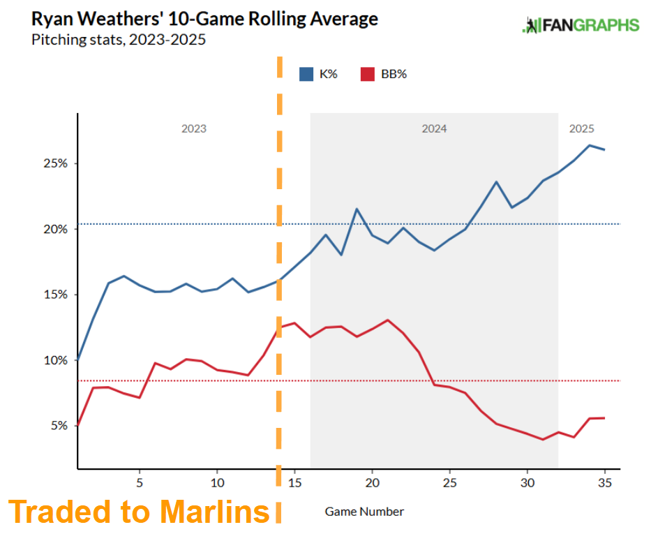 One hesitation about Weathers’ long-term outlook is in his downward-trending groundball rates. Where this was a cause of excitement in his 2024 campaign, almost altogether dropping the sinker that yielded a 56% GB rate in 2024 will naturally result in fewer groundballs. While this isn’t a major cause for concern, it is something to monitor moving forward and will play as more of a factor if Weathers sees negative regression in his strikeout rates.