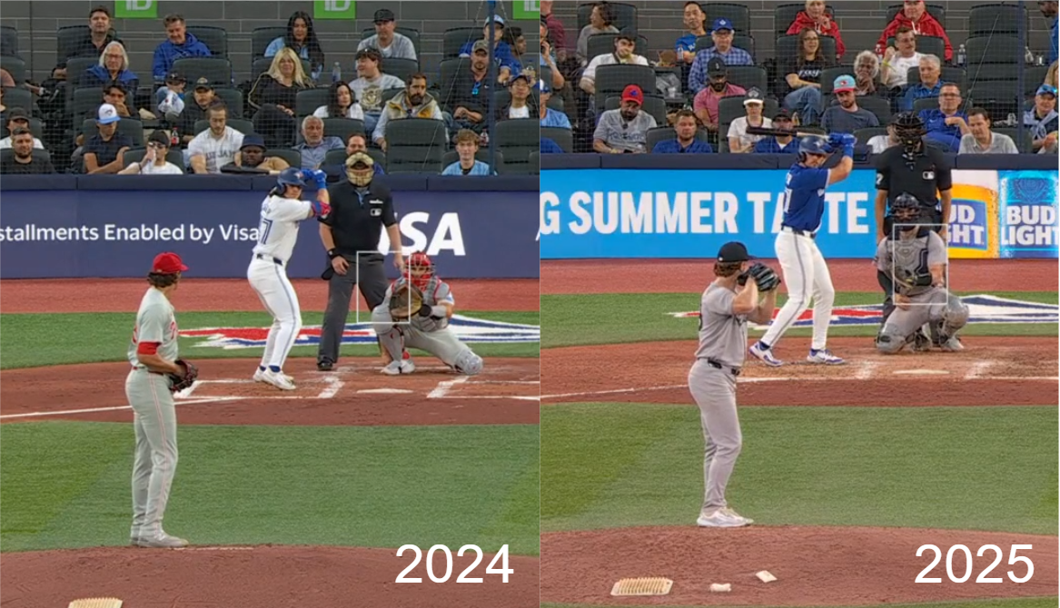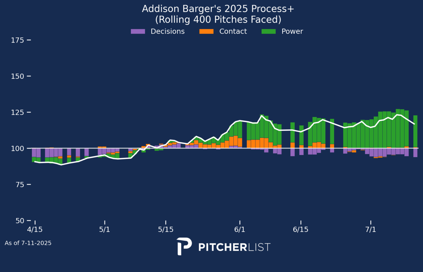 While he carried a similarly fierce swing last year, Barger just wasn’t quite able to put it together in his 69-game 2024 season. After posting a paltry .601 OPS, Barger came into 2025 with a tweaked swing. Though he’s employed a big leg kick in both years, he opened up his stance from 15° to 53° and pulled his feet a bit closer together. This change has helped him catch the ball more out in front of his body, leading to a strong 24.0% Pull AIR percentage and a resultantly elite 14.5% barrel rate.