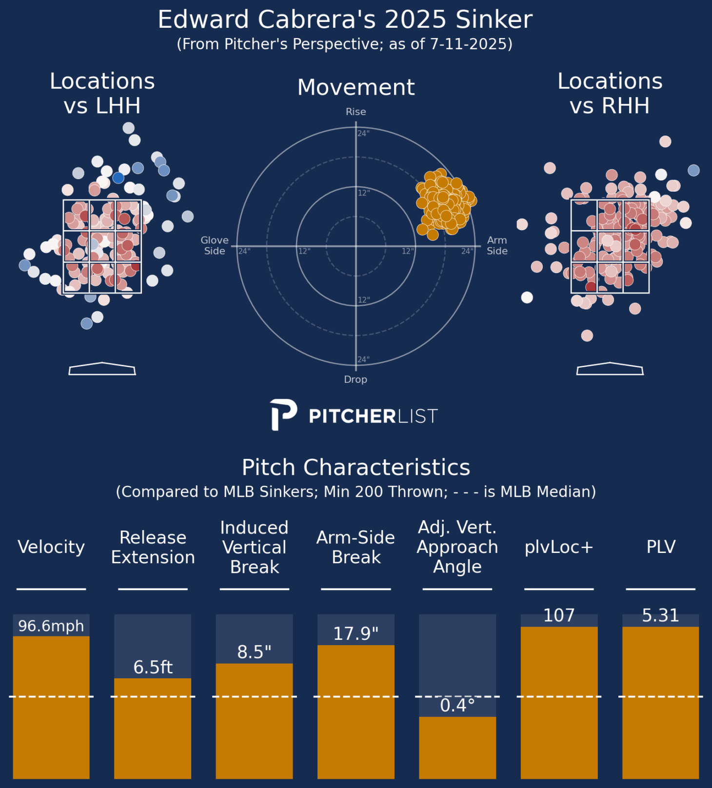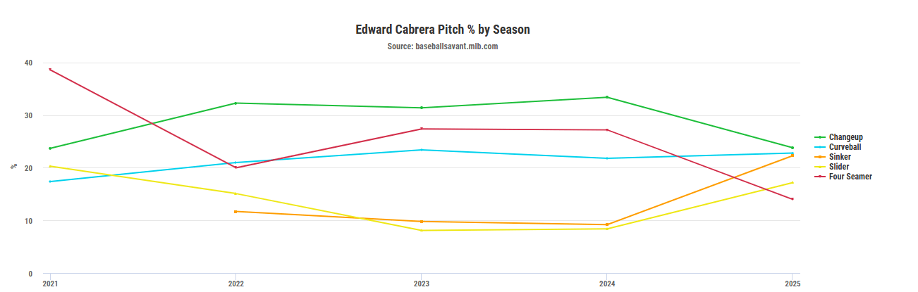 Edward Cabrera has been an exciting name for a few years thanks to his strong set of pitches. Traditionally pitching from a low-40°s arm slot angle, Cabrera has usually leaned on his incredible changeup to get a strong combination of whiffs and ground balls. Though he’s flashed signs that he was putting it all together back in 2022, his 2023 and 2024 seasons left some meat on the bone. But so far, his 2025 season has been a different story with an improved 3.61 ERA in 82.1 innings of work.