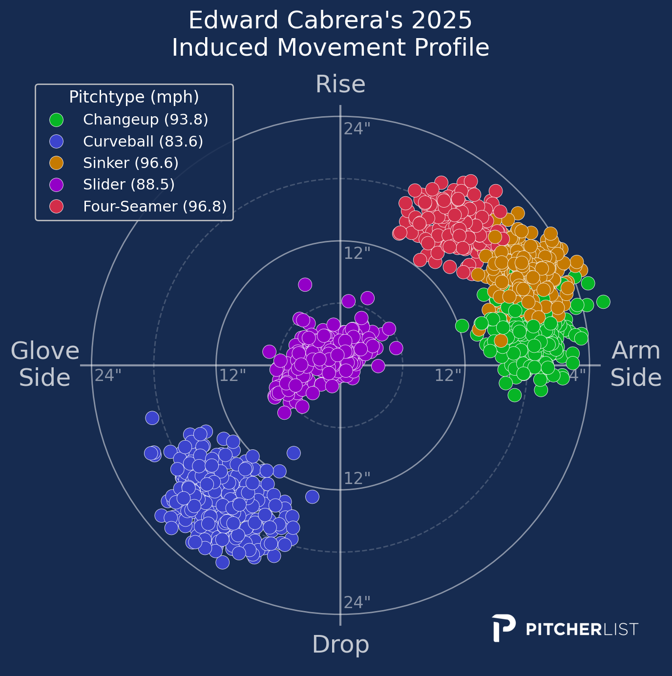 Cabrera has made some changes coming into this season that have helped him access the potential he has been flashing. He has lowered his arm slot by a substantial margin from a 42° to a 36° angle. This has helped him to get additional natural drop out of his changeup and has also helped him get much more induced break on his curveball.