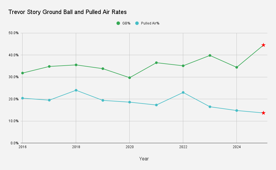 But Story isn’t really doing what made him so successful years ago with the Rockies. Though he has always carried concerning strikeout rates, Story historically found success with his bat by pulling balls efficiently in the air. In his 30+ HR 2018 and 2019 seasons, Story had a 24% and 19.4% Pull AIR%. But so far in 2025, Story has seen the worst rate of his career at a below-average 13.7%.