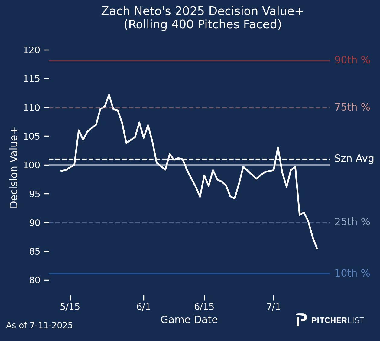 Neto was a prospect who was expected to be decent at all aspects. FanGraphs gave him a 50 FV, 50/55 Hit, 40/50 Game Power, 50/50 Raw Power, 55/55 Speed, and 50/50 Field. They also rated him as their 66th overall prospect in 2023. He had a very solid 2024. In 602 PA, he posted a .249/.318/.443 slash, 23.3% K%, 6.5% BB%, 23 HR, 30 SB, and a 115 wRC+. In 344 PA so far this year it has been more of the same, but he’s really taken off recently. In 73 PA since July 2, he’s had a .333/.397/.530 slash and 157 wRC+. Is he taking his game to another level?