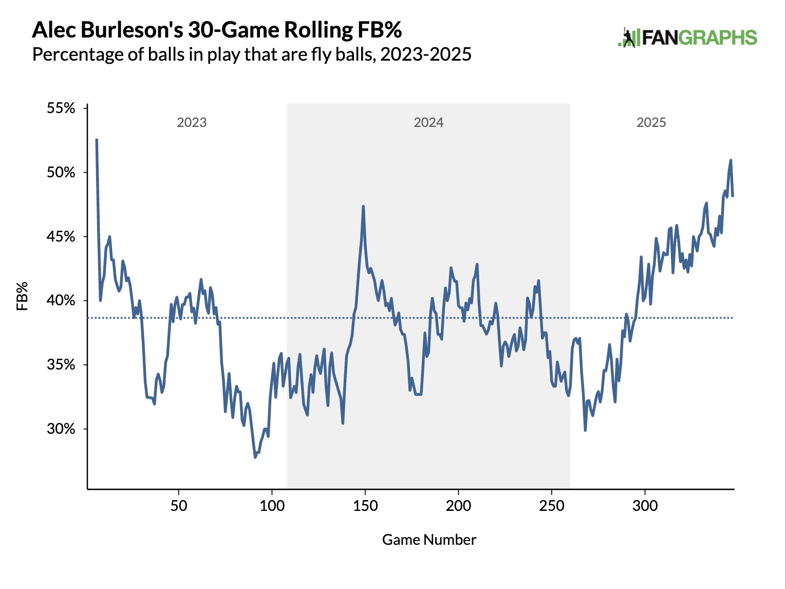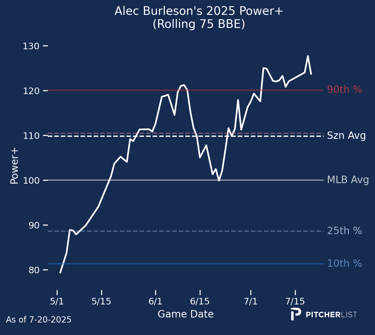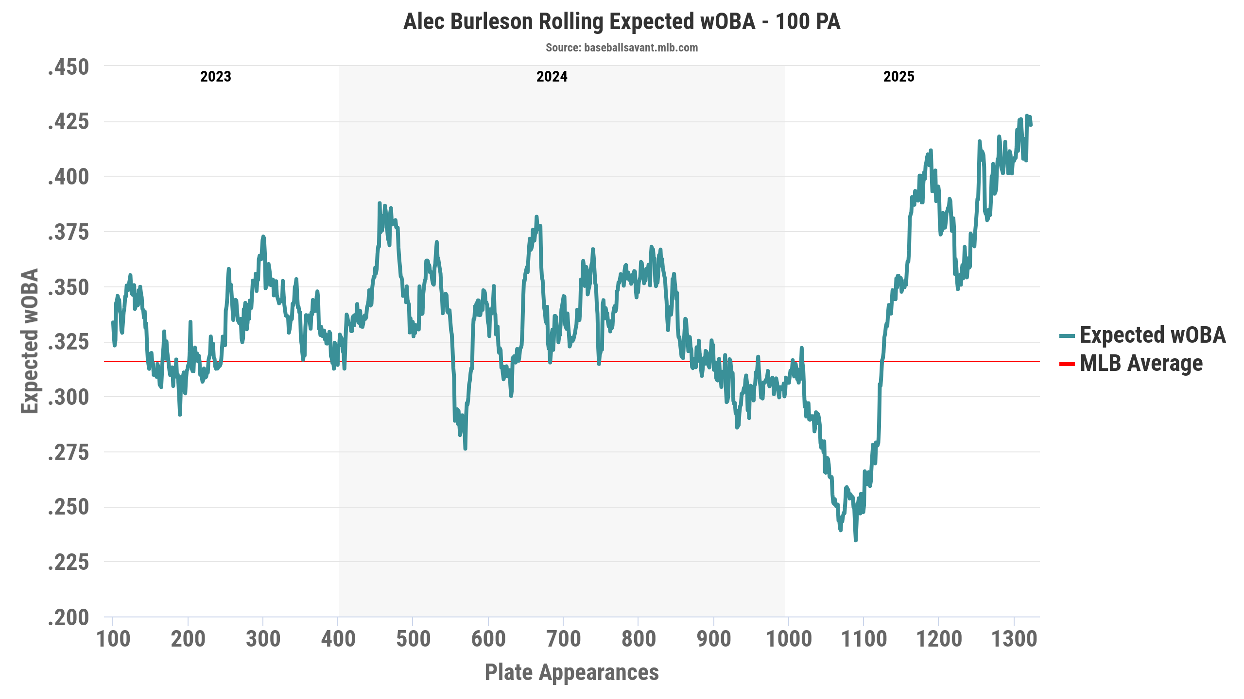 In 1,087 PA prior to May 1, 2025, Alec Burlseon had a .256/.306/.393 slash, a 13.3% K%, a 6.3% BB%, and 94 wRC+. Now he’s just 26 years old, but that’s not a useful 1B/OF in fantasy. He displayed the OK Hit and Powers tools he was expected to have with a .256 Avg and 30 HR, but you need more from those positions. Maybe he was never going to be a useful fantasy player in most formats.