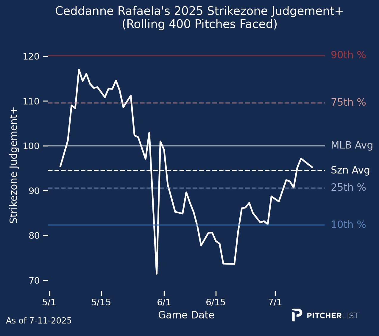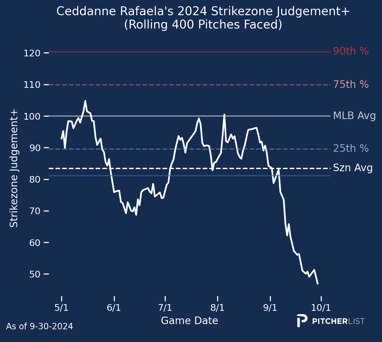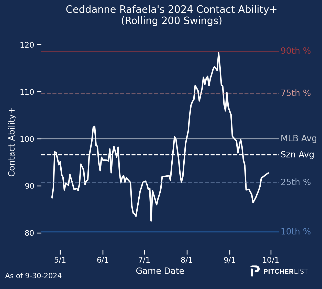Rafaela has always been known as a free swinger. In each of the last two seasons, he’s had the 2nd-highest Swing%, and in 2024, he had the highest O-Swing%. Fortunately for him, he has good contact ability, allowing him to keep his K% palatable. However, he has below-average Bat Speed and has always posted low ISOs. Because of this, he needs to put the ball in play more. In order to do that he needs to improve his Plate Discipline.