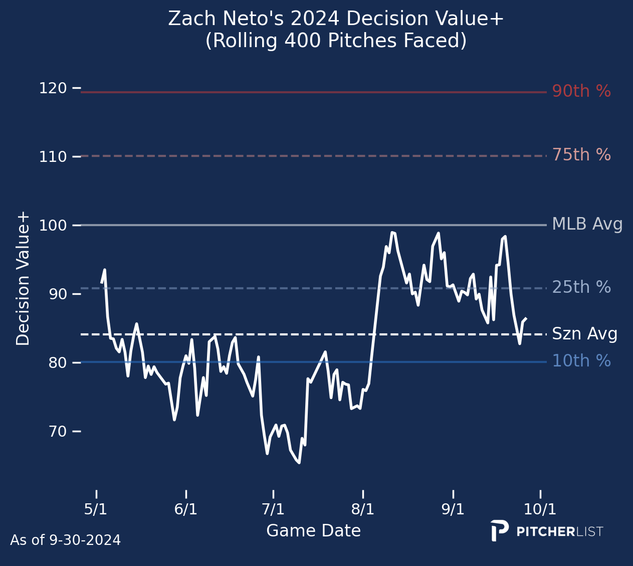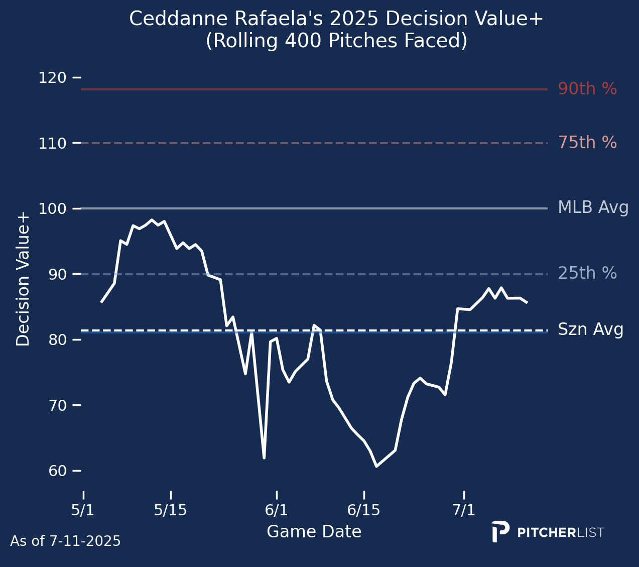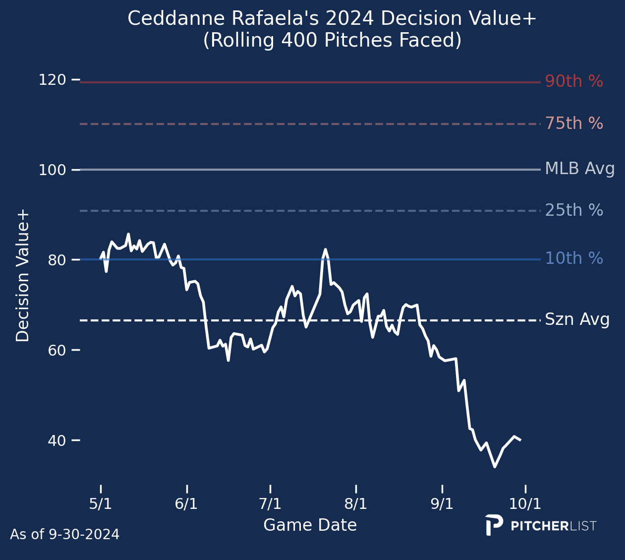 His Decision Value has been declining recently, but his season average is up about 17 points from 2024.