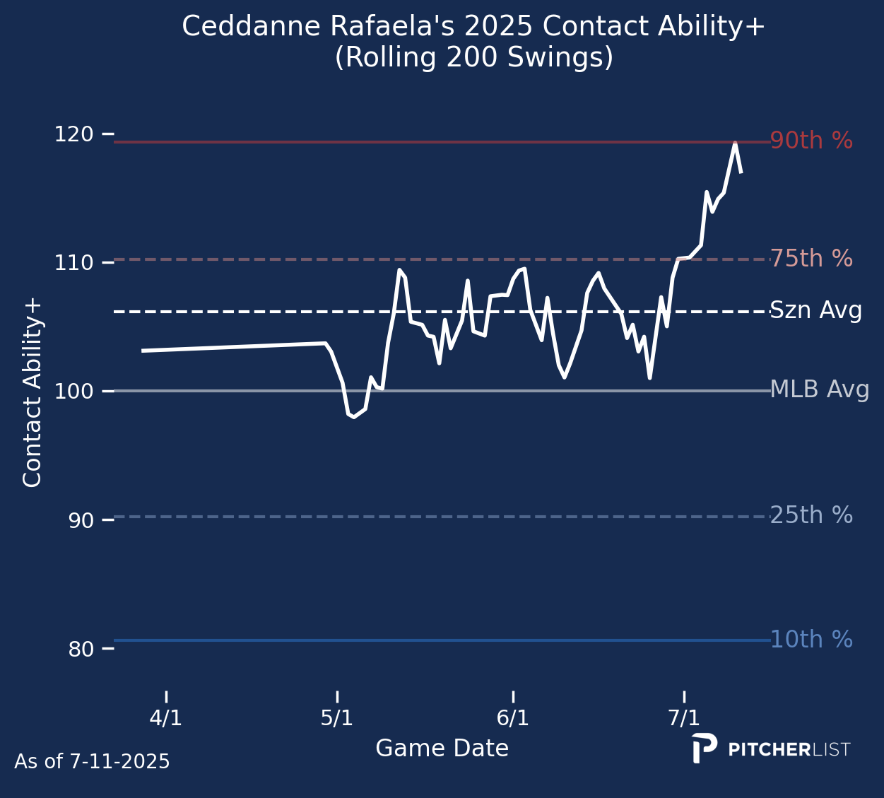 In 2024, he had a 69.9% Contact%, and this year it is up to 75.5% (40th percentile).