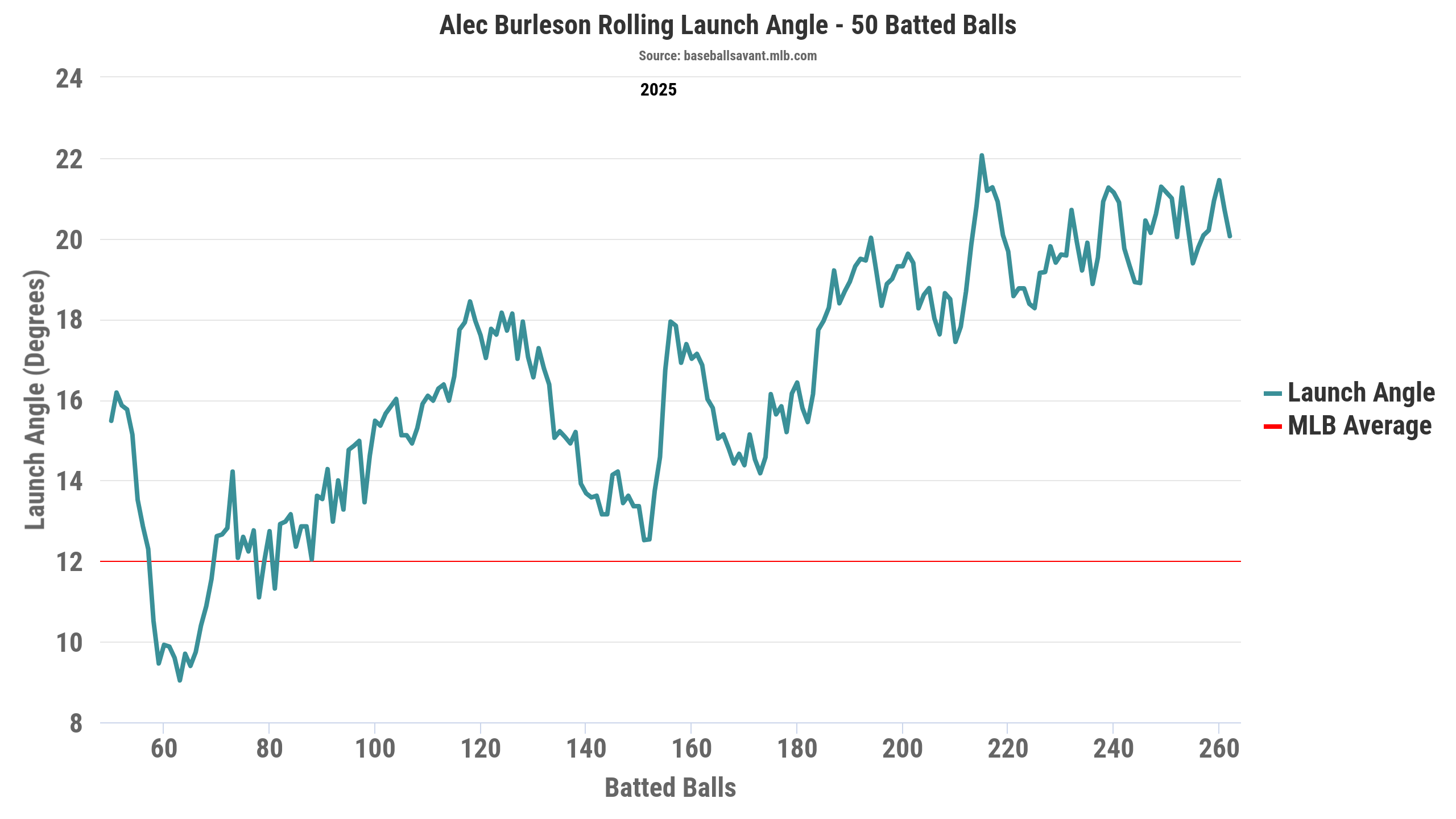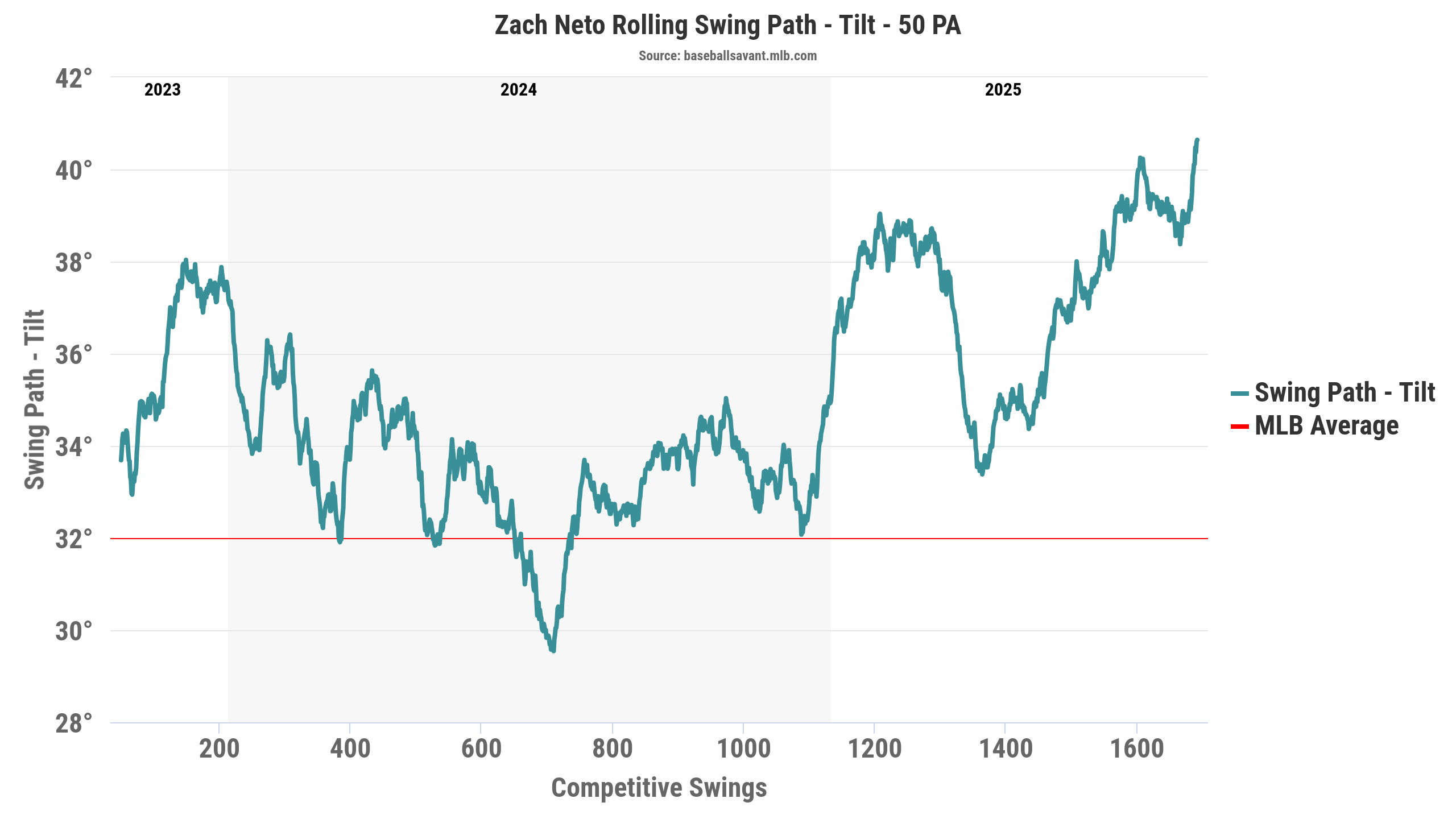 Verdict: Legit, but not superstar legit. There is no doubt Neto is a great player who has continued to show improvement this year. However, his hot streak of the last three weeks seems to be largely driven by an unsustainable increase in Line Drive%. He should continue to be a great player, but I don’t expect his superstar-level performance of the last few weeks to remain for the rest of 2025. Given his age and ability to improve, that may be in his future, though.