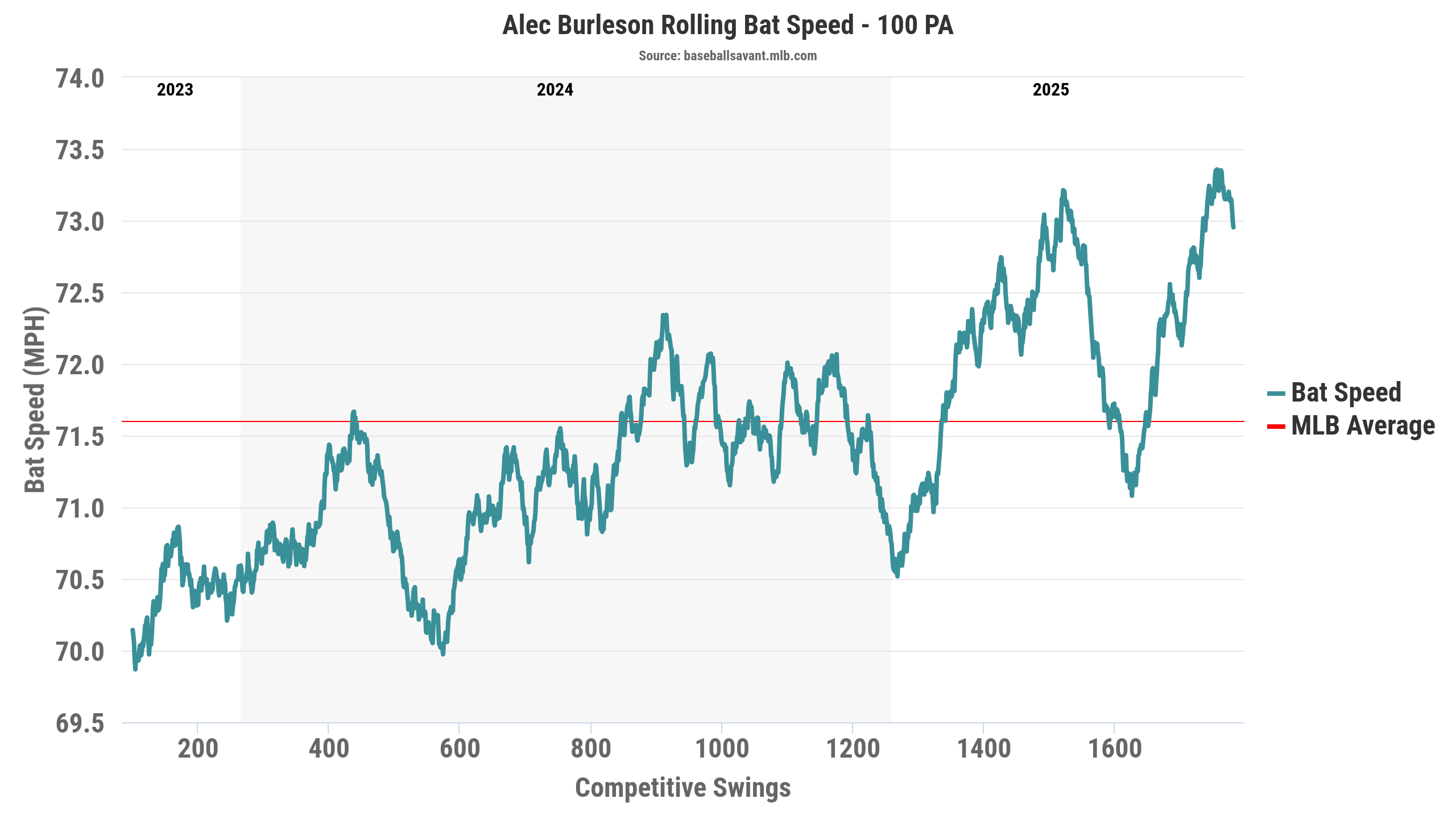 Verdict: Legit. Burleson has maintained (and even improved) his K%, while improving his Bat Speed and hitting more Fly Balls. This has led to a direct increase in power.