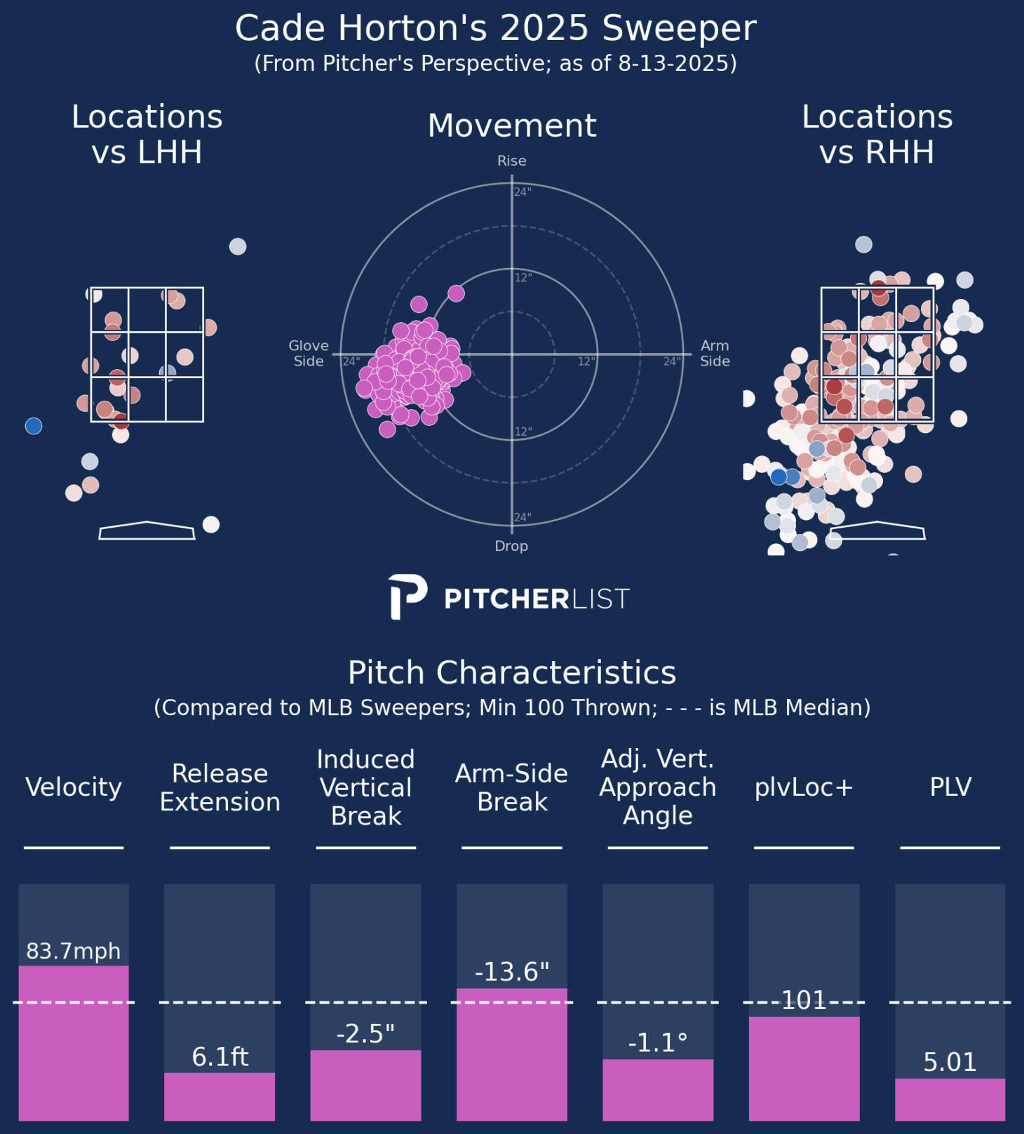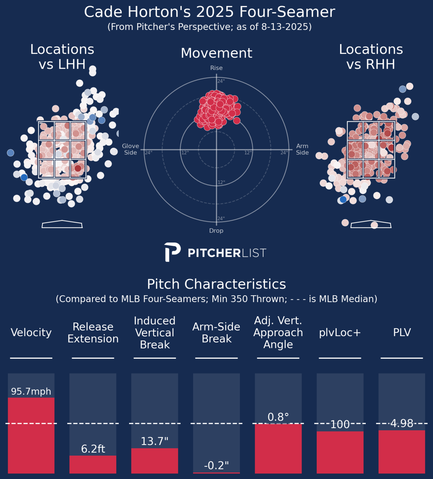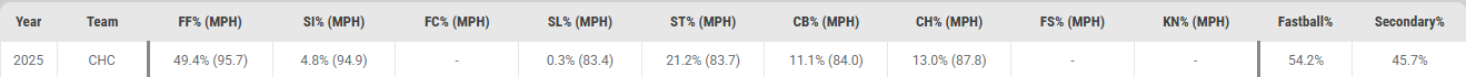 It’s metrics are middling, but it has served him well. He throws it in the zone 60% and has a 29.3% CSW% (69th percentile), but it also generates a ton of groundballs. Its 49.2% GB% is 92%. He locates it more like a traditional sinker also with a 35.0% loLoc% (95th percentile). Not a bad idea given the Cubs’ defense.