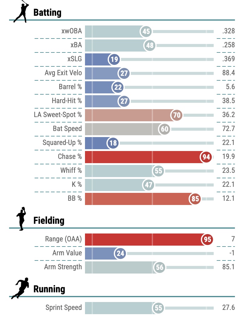 Process+ is basically an xwRC+ and it is average. His 72.7 mph Bat Speed is slightly above average, his 5.5% Barrel% is below average, and his xwOBA is 37 points lower than his wOBA, using Baseball Savant. He also has a .361 BABIP.