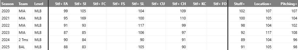 Above is the Stuff+ breakdown of his pitches throughout his career. Again, there is nothing that seems to support his breakout this year. He has good Location+, but that’s always been there for him.