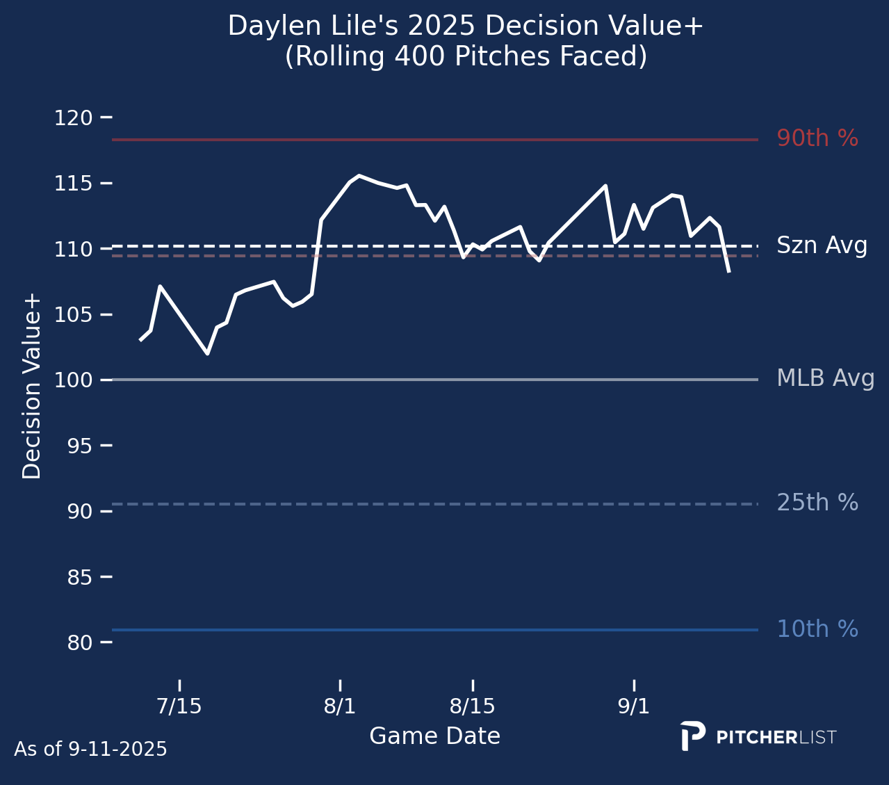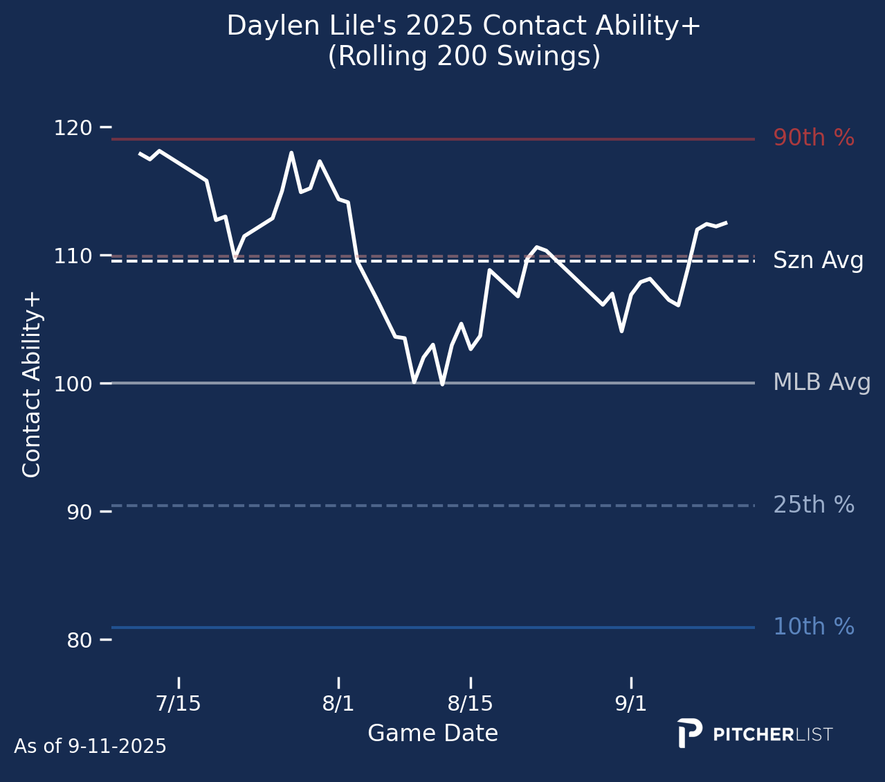 To be honest, I had never heard of Daylen Lile, and, considering FanGraphs rated him as the Nationals’ #5 prospect and outside the Top 100 overall, I’m guessing he was largely unknown outside of the Nationals’ fanbase. He is 22 years old, and FanGraphs gave him a 45 FV, 40/55 Hit, 40/45 Game Power, 40/50 Raw Power, 60/60 Speed, and 30/40 Field. Given full playing time since he came up on May 23, he has 306 PA, a .288/.339/.457 slash, 16.3% K%, 6.2% BB%, and 120 wRC+. In 258 PA since June 19, he has a .311/.362/.477 slash, 15.9% K%, 6.6% BB%, and 133 wRC+. That wRC+ is good for 34th in baseball over that period and is tied with Junior Caminero and Jazz Chisholm Jr. How has he been outperforming expectations by so much?