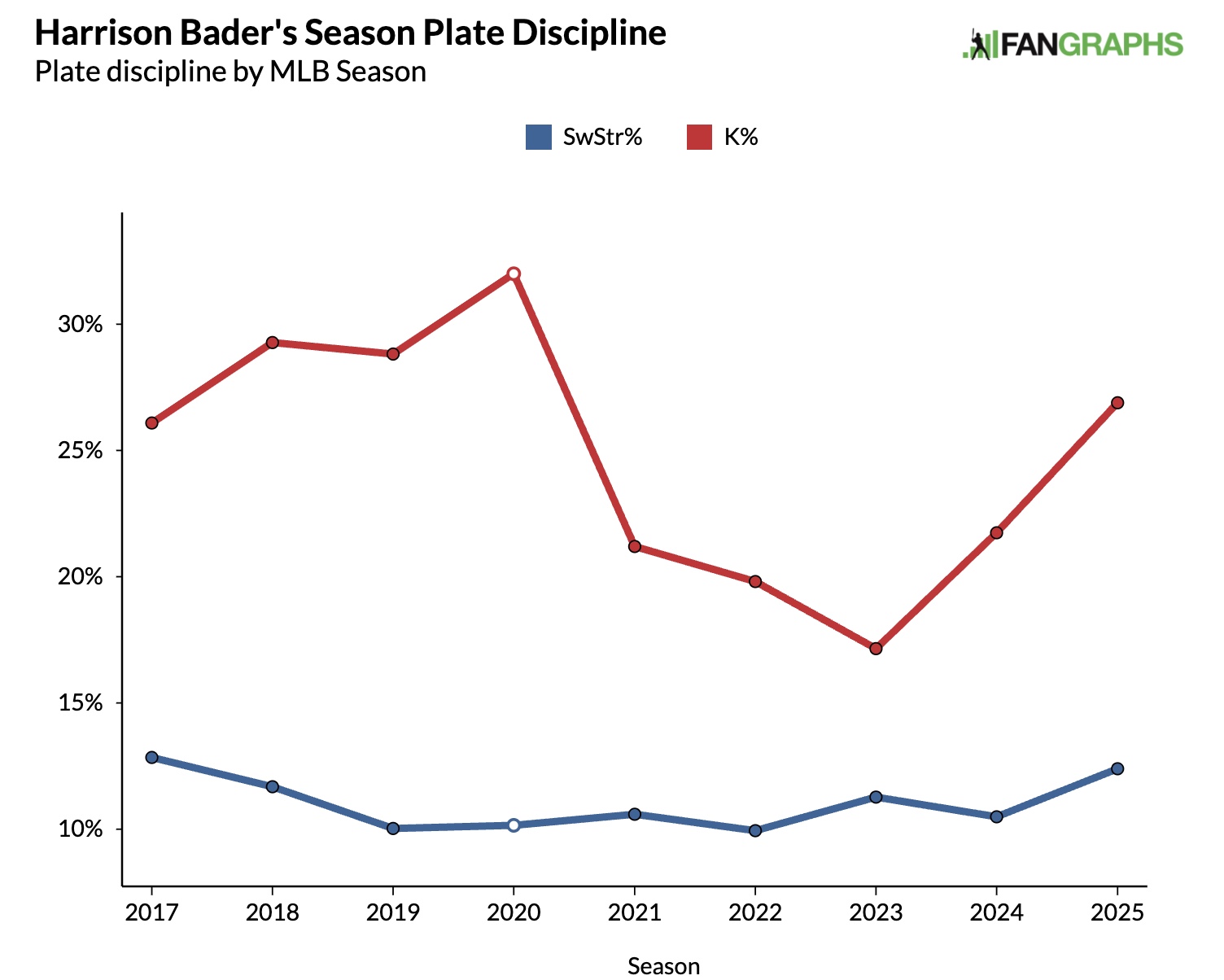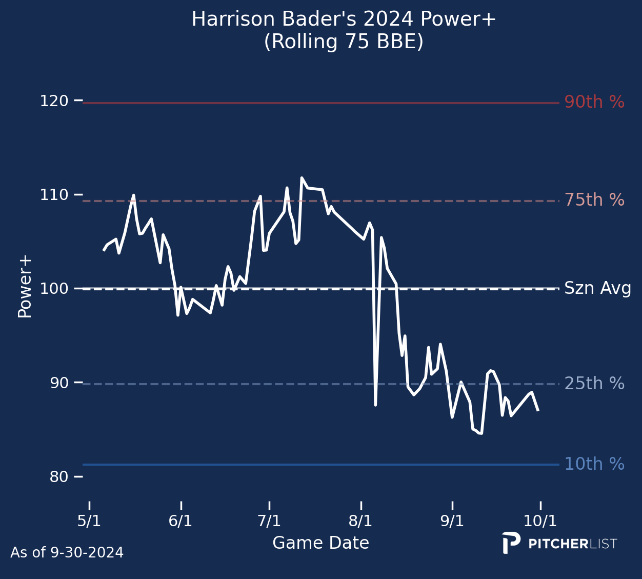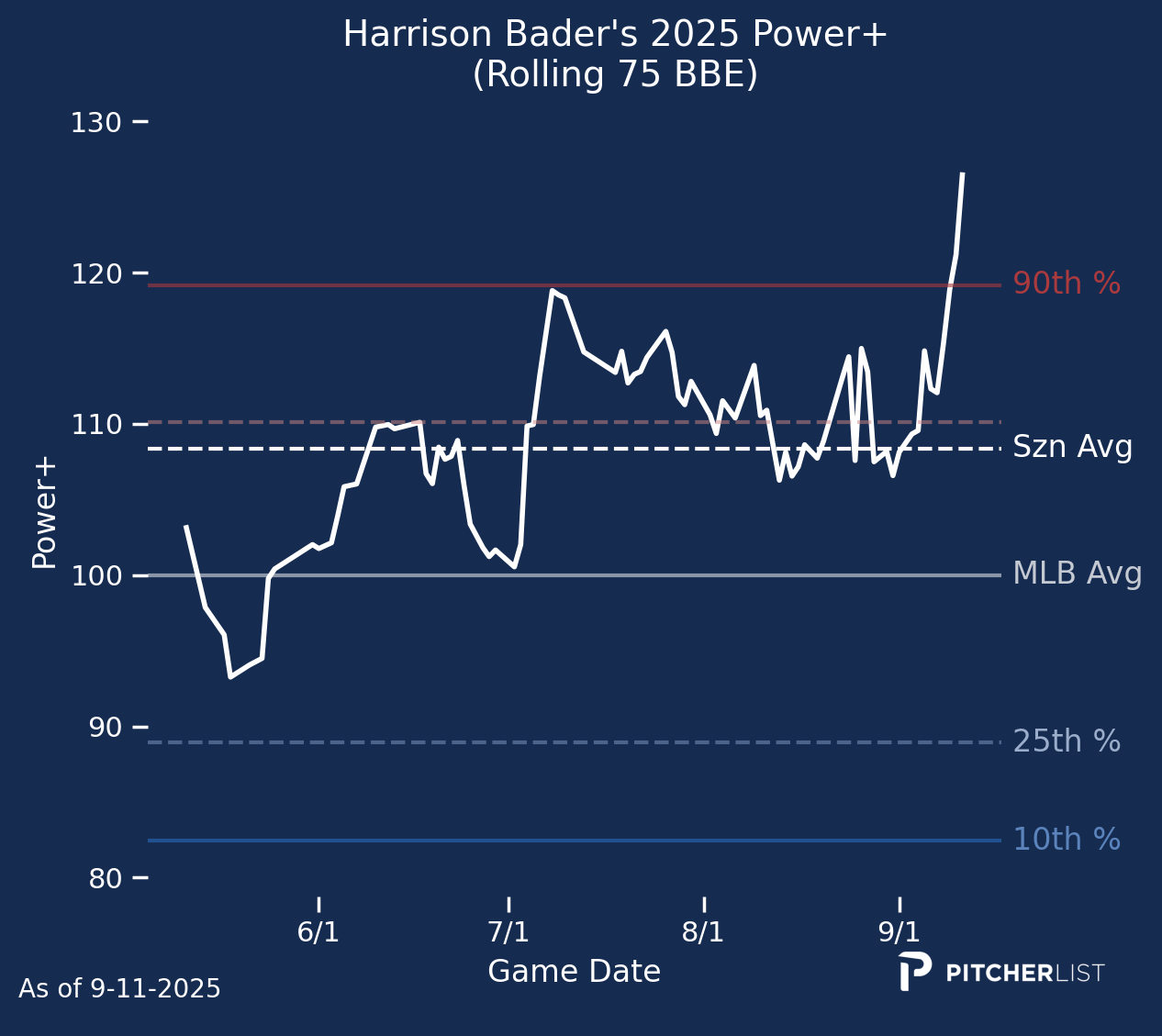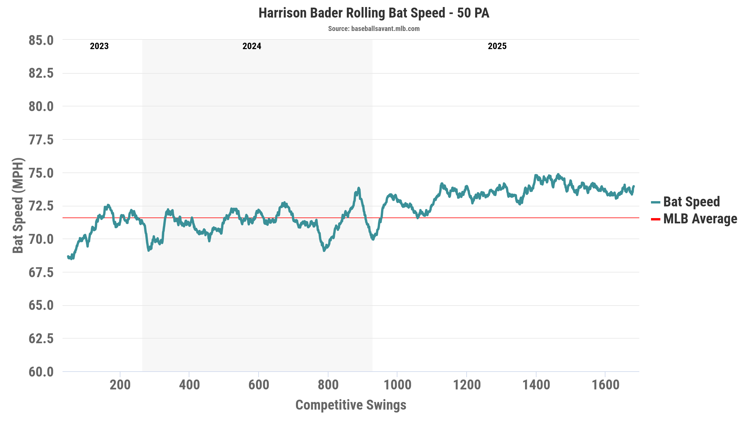Bader has seen a big jump in his Bat Speed. In 2023, it was 70.9 mph, last year 71.2 mph, and this year it is 73.5 mph. He’s gone from below average to the 70th percentile.