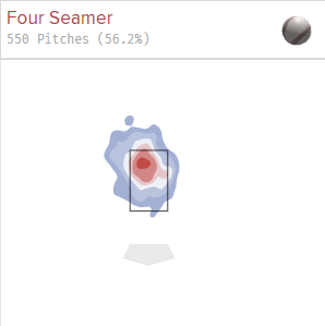 Like many young pitchers, he is still figuring out how to use his secondaries. He uses his cutter a bit more against RHB than LHB, but it’s similar. It gets mixed results. More or less ditto for his sinker. It’s hard to argue with his fastball usage. His four-seamer has been so effective I wouldn’t want him to throw it less, but the sinker and cutter give him different weapons to keep hitters off guard and follow the trend of having three fastballs.