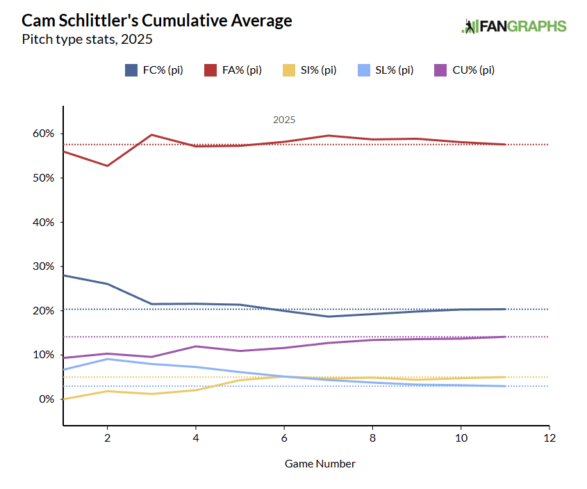 Schlittler’s pitch usage has been pretty steady, so I don’t think any pitch mix changes have caused his recent hot stretch.