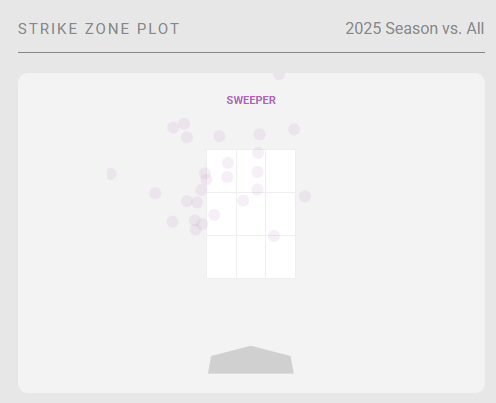 His curveball has a 14% overall usage, but 21.6% vs LHB. It is his primary secondary against them. Against them, it has a 12.7% SwStr% (57th percentile, 27.1% CSW% (23rd percentile), and a 69.6% GB% (90th percentile). It’s 83.1 mph, which is 90th percentile, but otherwise does not stand out stuff-wise. Like his other offspeed, he could do a better job keeping it low. It’s 65.3% loLoc% is 53rd percentile. If he kept it lower, it might have a better SwStr%.