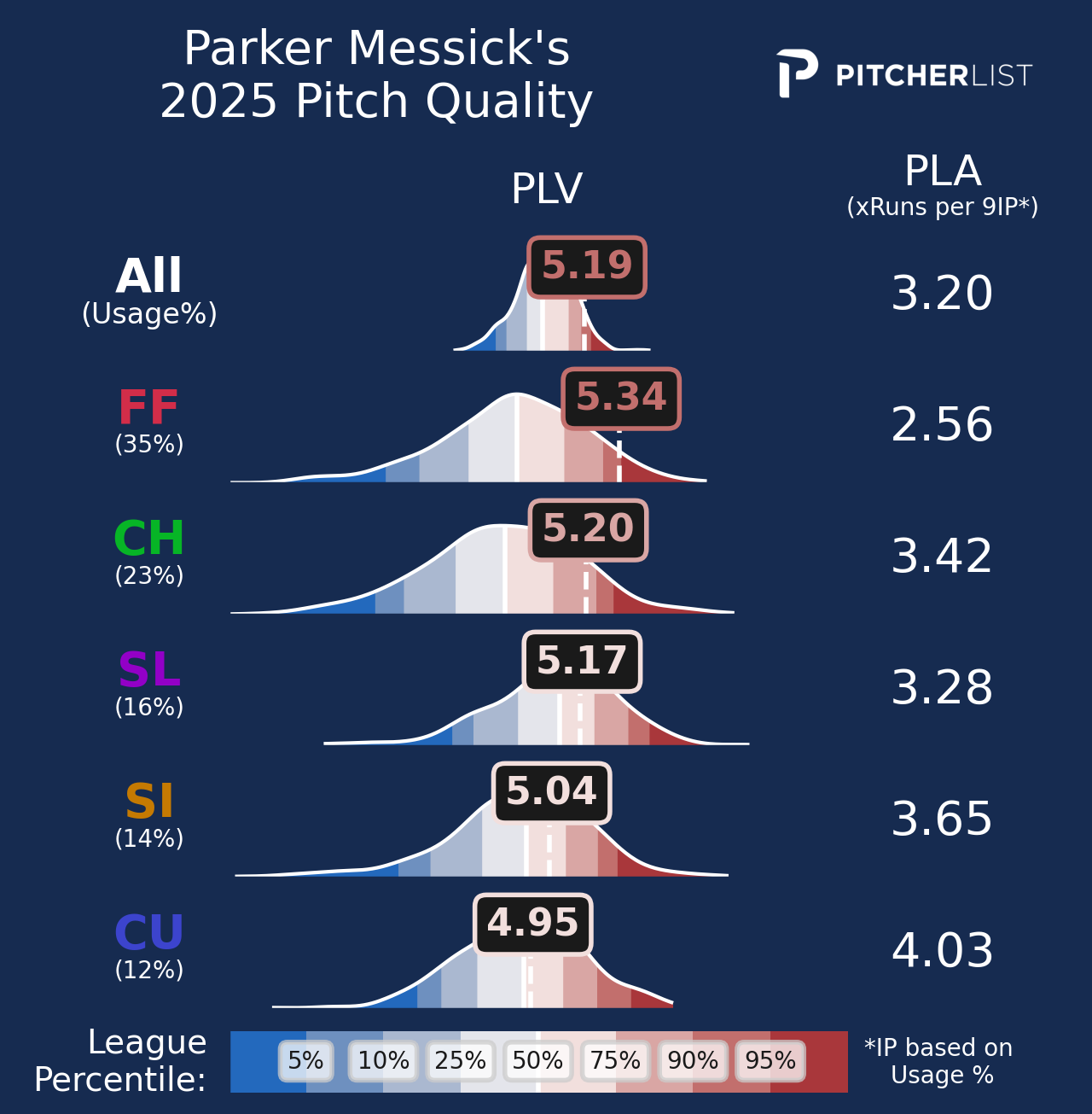 It certainly thinks more highly of them than Stuff+, especially his four-seamer and changeup, his two most thrown pitches. However, PLV takes location into account for each pitch. Stuff+ does not.