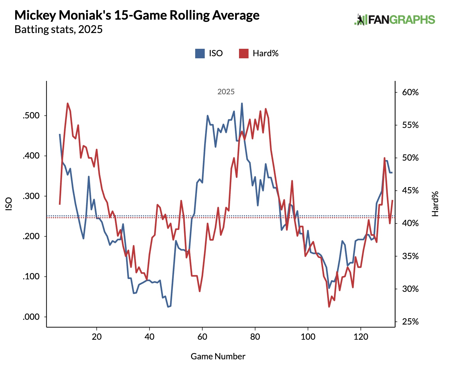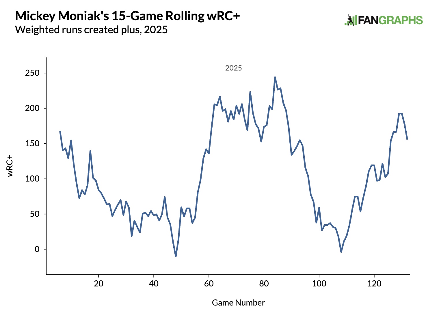 Moniak is a 27-year-old OF who has spent time with the Phillies, Angels, and the Rockies in 2025. With the Angels in 2023, he had a 115 wRC+ in 323 PA. In 445 PA this year, he has a 112 wRC+. He’s arrived at that number in roller-coaster fashion.