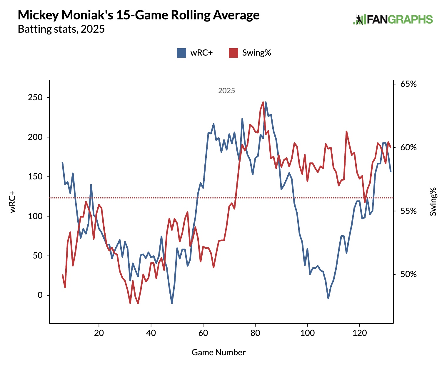 Moniak’s recent success correlates with an increase in Swing% closer to his career average of 57.2%.