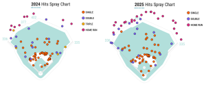 Wood’s improved batted ball profile can be visualized by taking a look at his batted ball plot on Baseball Savant. After only hitting two home runs to the pull side in 2024, Wood has hit around seven home runs so far in 2025 that can be considered pulled fly balls. By being able to pull the ball in the air with more frequency, Wood has been able to take advantage of the most favorable batted ball outcome for a hitter, while also being able to rely on his plus raw power to drive balls for damage to the opposite field.