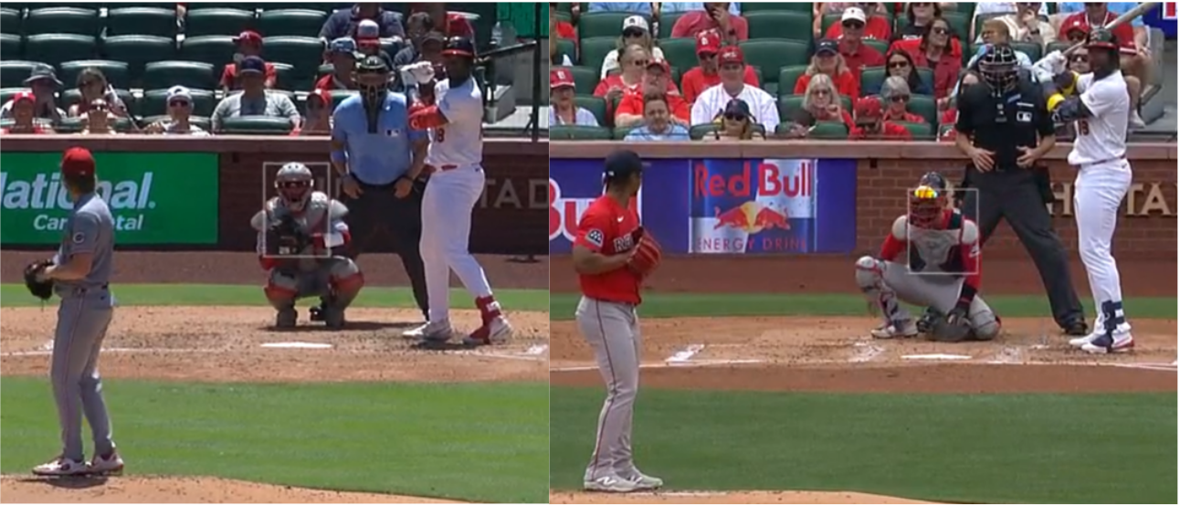 Jordan Walker batting stance comparison, June 2025 (left) vs April 2026 (right).