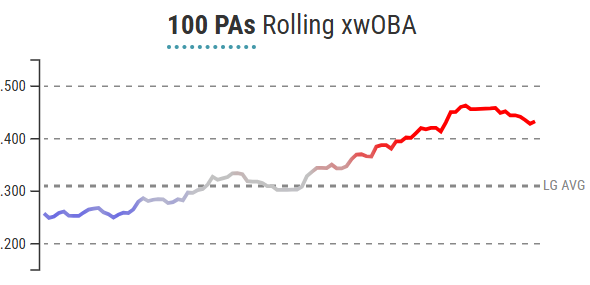 If he doesn’t completely disappear over the next couple weeks, this will go down as the best month of his career. The last time he posted a wOBA over .400 in a single month was June 2023 at the dawn of his career, and he’s at .467 so far in April. I’d be quite surprised if he led the league in homers and had a wRC+ anywhere near 200 by season’s end: His BABIP currently sits at .350, nearly 40 points above his career norm, and over 30% of his flyballs have left the yard, nearly triple his career norm. At the same time, his underlying numbers are excellent: His xwOBA is not too far behind reality at .451, his hard-hit rate is a hair over 60%, and his xwOBA on balls in play is in excess of .600. To say he’s destroying the baseball is an understatement, and he made some adjustments to do so.