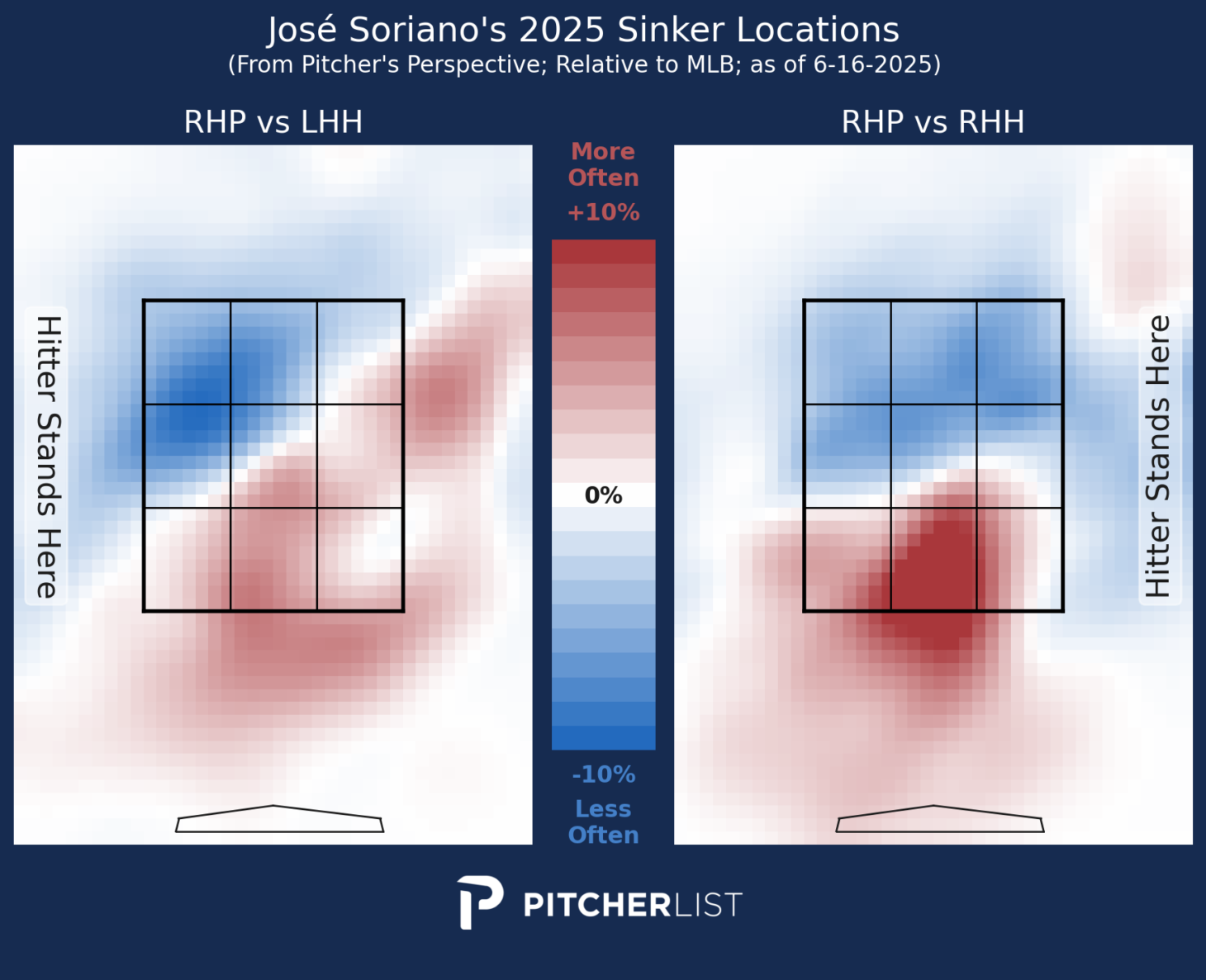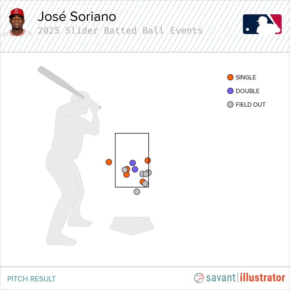 More hitters are swinging at the pitch and getting rewarded. A 53.8% ICR is over double 2024’s figure, resulting in a .280 average against. A .538 BABIP is unreasonable and unlikely to stay, but those locations don’t lend themselves to good batted ball results. Across the board, Soriano has more sliders leaking back into his armside, and righties are punishing him.