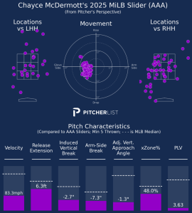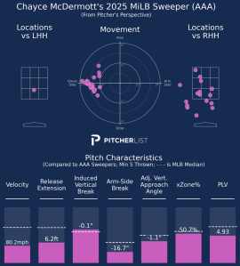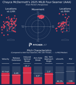 McDermott’s game was never built on pristine control. It was his raw stuff that made him a fringe Top 100 prospect and gave Baltimore hope he could carve out a role in the back end of the rotation. Now, even that seems in question. According to PLV, none of his primary pitches grade out as league average, and his top three offerings all fall under a 4.00 PLV, well below viable MLB standards.