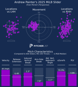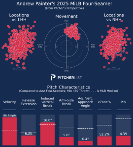 The four-seam fastball has been Woods’ bread and butter since I first started watching him, and the metrics on this day back that up. He was not only averaging 95.7 mph with the pitch, but saw elite marks of 6.8 feet of extension and a 1.5 HAVAA. Add in that he filled up the strike zone, and there should be no concern about Wood’s fastball. Managers should trust the Phillies to round out the rest of his arsenal and keep him as a starter for the long haul. Wood isn’t as close to The Show as Painter is, but a great 2026 could push him into the 2027 rotational picture before that season’s end.