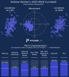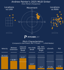 Context matters for fantasy. Painter is young for the level and making his first full-season push after surgery, a phase where walk rates and pitch efficiency often lag before snapping back. The 23.1% strikeout rate remains comfortably fantasy-viable, and Triple-A run environments can inflate ERAs and WHIPs even when the underlying traits are trending right. The Phillies’ handling this summer—moving him quickly to Triple-A but resisting the call-up drumbeat—suggests they still see a long runway for a rotation anchor rather than a rush to the big league rotation. The stamina is still certainly a work in progress for Painter, who saw his strikeout and walk rates heading in the respective wrong direction in the second half of the season. But that is still understandable, again, due to the long layoff and still knocking off the rust that can only be removed after an entire season of work.