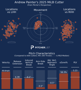 Stuff-wise, evaluators remain bullish. FanGraphs still lists Painter as a 60 FV starter at Triple-A, an endorsement that signals top-of-the-rotation potential if command and secondaries finish returning post-surgery. His fastball velocity has looked intact by public reports, and the Phillies have emphasized development over promotion as he experiments with shapes and sequencing deep into the season. The curveball and cutter are both MLB-quality pitches, thanks to his overall control and well-above-average velocity.